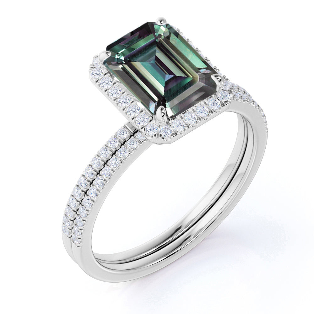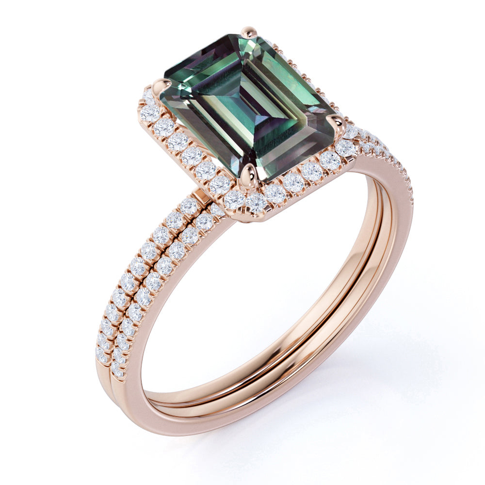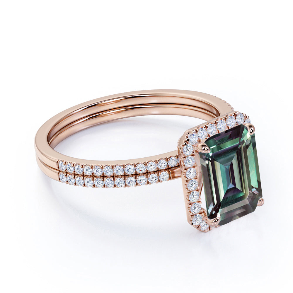 1.75 Ct Emerald Cut Lab Alexandrite Halo Pave Bridal Set