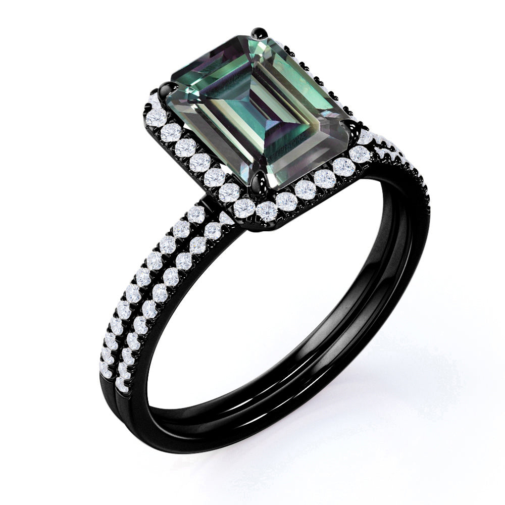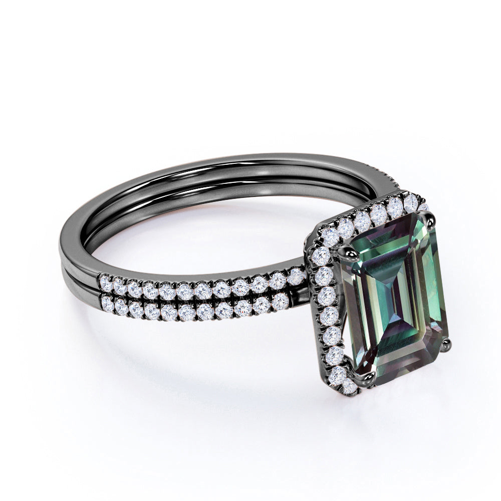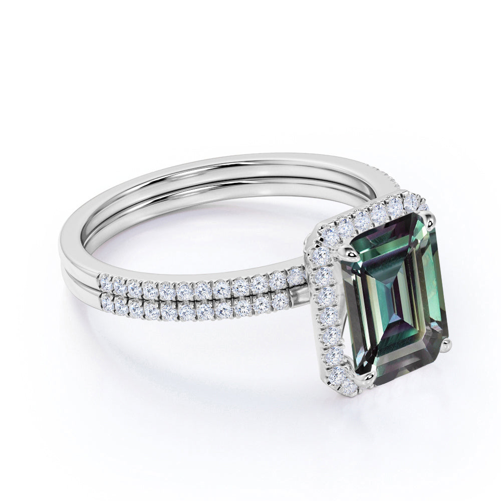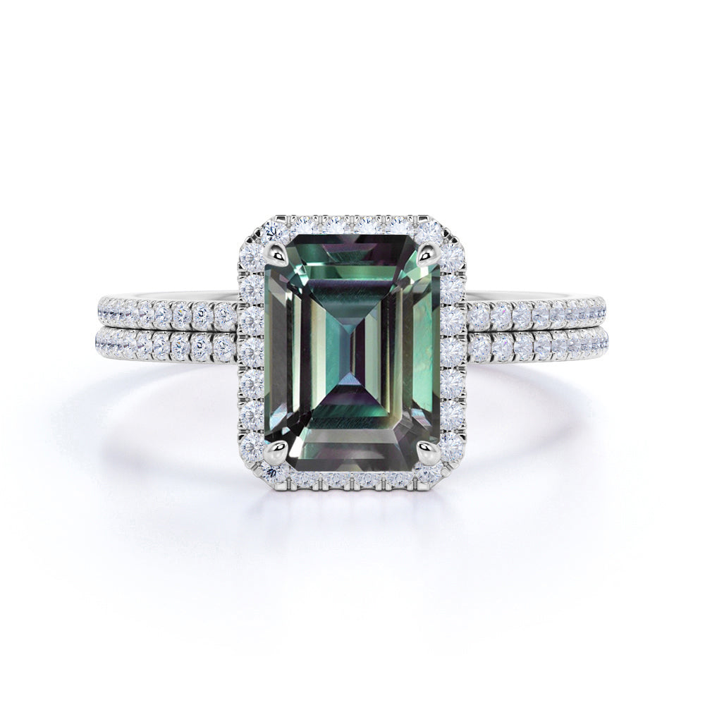 1.75 Ct Emerald Cut Lab Alexandrite Halo Pave Bridal Set