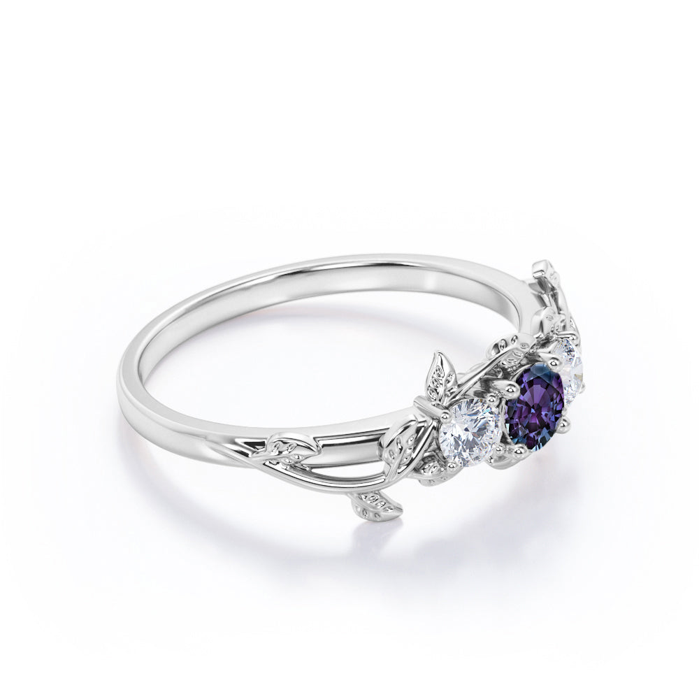 Antique Leaf Design 1 Carat Round Cut Lab Created Alexandrite Three Stone Engagement Ring In White Gold. Your unique love deserves a unique ring as well. Presenting our unique leaf style synthetic alexandrite and diamond engagement ring for your iconic love story. This round cut alexandrite ring features two round brilliant diamonds precisely cut to frame a third round brilliant center stone. Handmade with utmost love and attention to detail by our devoted artisans, this three stone ring will definitely complement you in any ensemble. The leaf style adds a certain charm to this antique alexandrite and diamond ring. This 1 carat round cut synthetic alexandrite and diamond three stone engagement ring in white gold can also be customized to 18k Gold plating over silver, 10k Gold, 14k Gold or 18k Gold as per your preference.