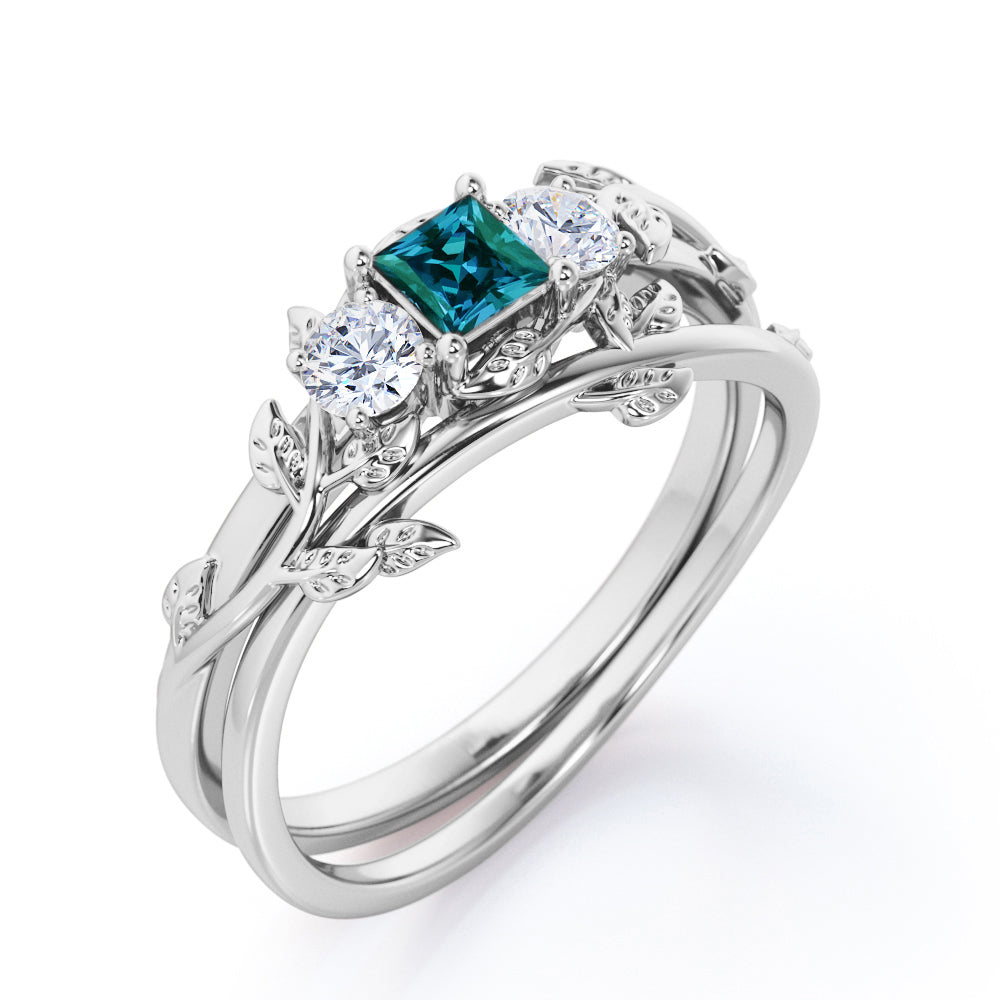 Floral design 1 Carat Princess Cut Lab Created Alexandrite And Diamond Nature Inspired Wedding Ring Set In White Gold. When you have found your perfect one, all that's left is finding that perfect ring that will hold all your beautiful memories. Showcasing our brand new addition to the collection which might be exactly that perfect ring you are looking for. This floral design wedding set features princess cut alexandrite at the center and two round cut brilliant diamonds as the side stones. The matching wedding band is intricately carved and crafted into delicate leaf and vines that wrap elegantly around the fingers. This trilogy wedding ring set is a study in timeless beauty and extreme attention to detail. This 1 carat round cut lab grown alexandrite and diamond nature inspired wedding ring set in white gold can also be customized to 18k Gold plating over silver, 10k Gold, 14k Gold or 18k Gold as per your choice.