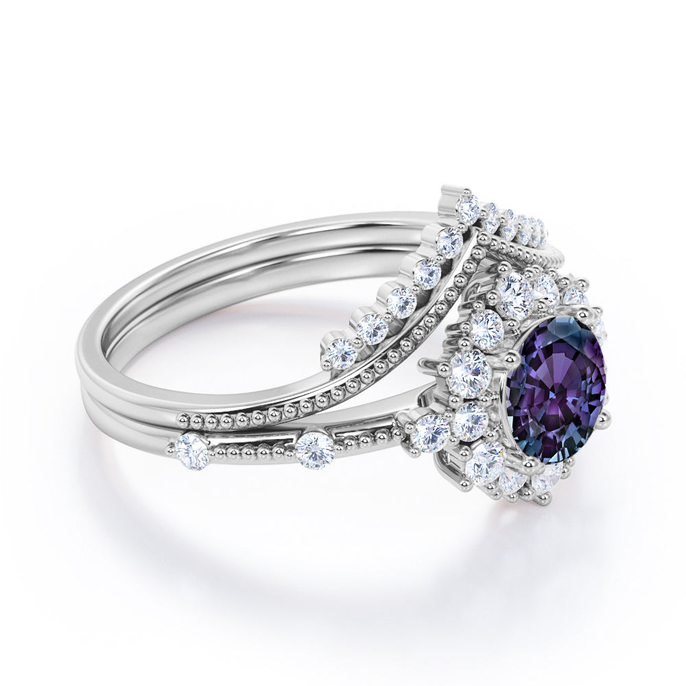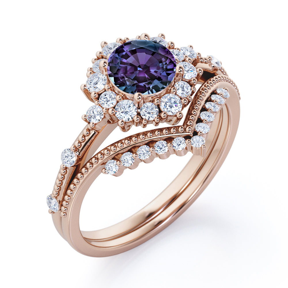 Tiara Design 1.40 Carat Round Cut Lab Created Alexandrite And Diamond Vintage Filigree Halo Bridal Set In White Gold. Looking for a wedding ring set with some vintage flair? We love this piece for the bride who is a romantic at heart. If you love the romantic appeal of a halo, this divine piece is just as perfect as its price tag. This chevron ring featuring a round cut 1 carat center alexandrite and 0.40 carat of glistening diamonds inclusive of a matching tiara design wedding band looks like a precious heirloom and has a distinct one-of-a-kind feel to it. A round alexandrite center stone is framed with a halo of pave diamonds, adding to the illusion of a larger center stone. The beaded motif detailing gives the vintage vibes to this bridal set which you are going to love for sure. This tiara design 1.40 carat round cut lab created alexandrite and diamond vintage filigree halo bridal set in white gold can also be customized to 18k Gold plating over silver, 10k Gold or 14k Gold as per your preference. So grab this antique piece now and begin your new chapter of life with keeping your wonderful memories alive in it for a lifetime.