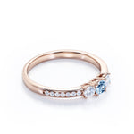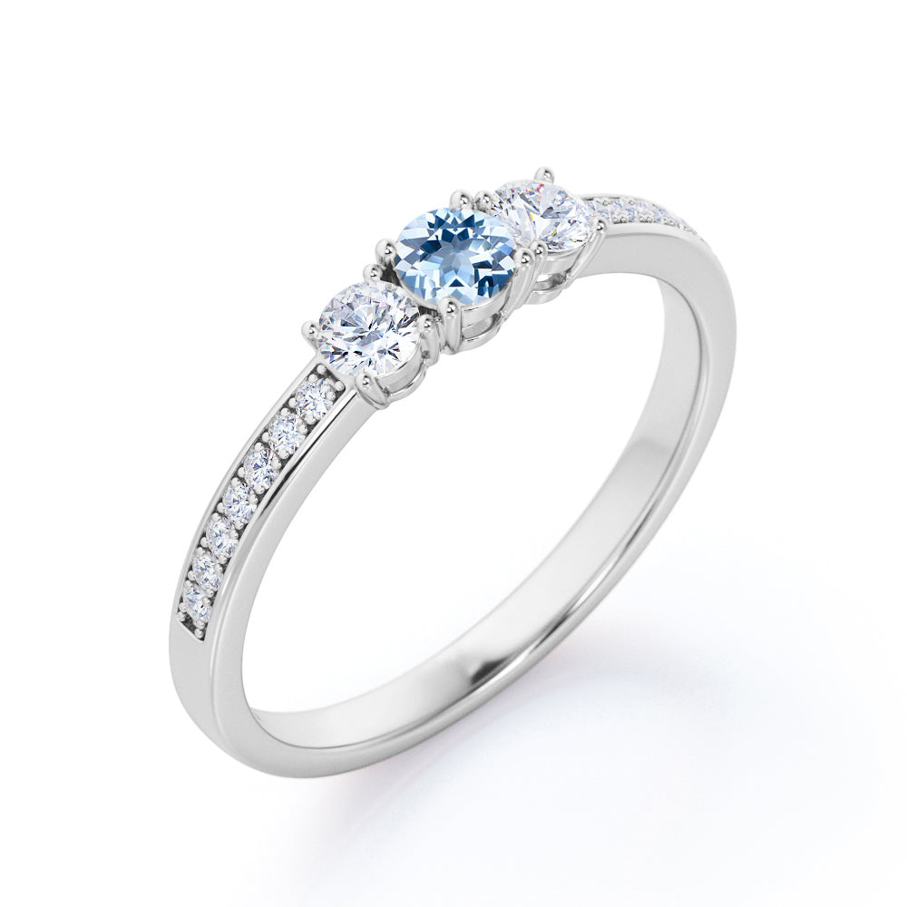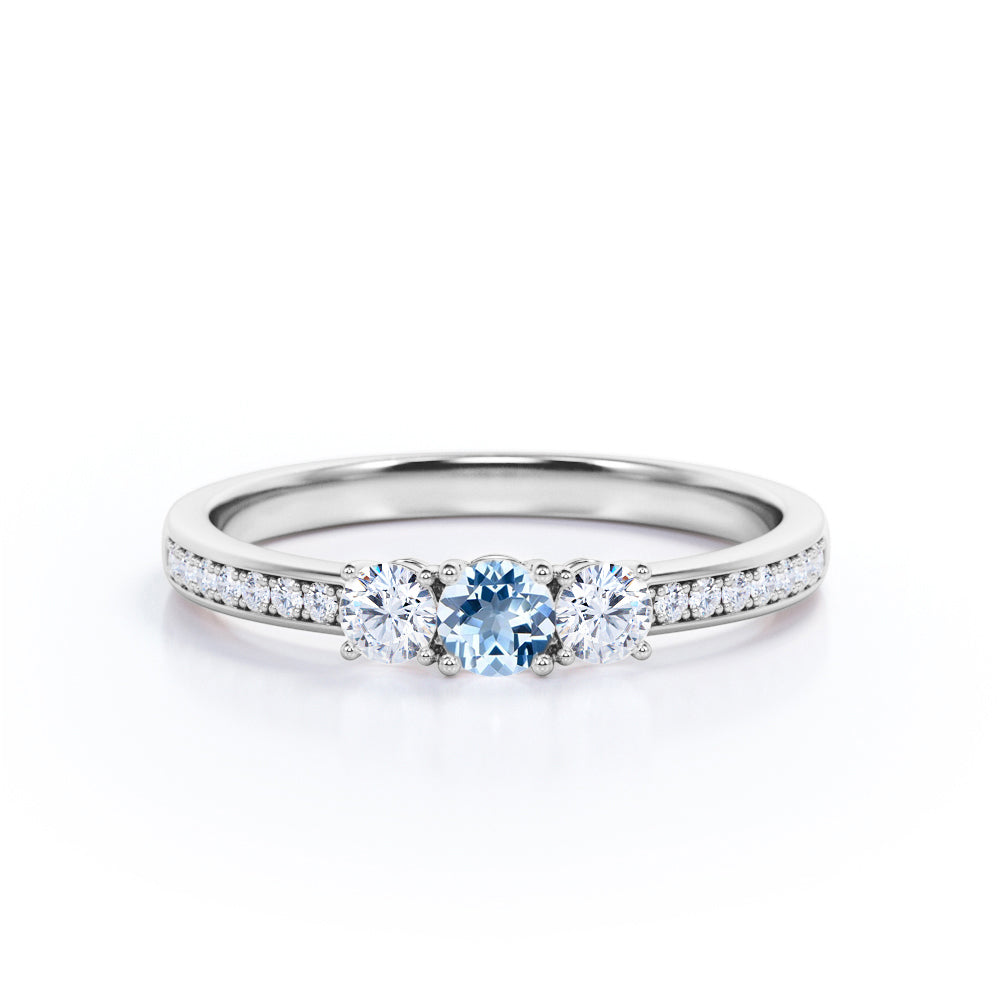 1.10 Carat Round Cut Aquamarine And Diamond Pave Engagement Ring in White Gold. Enrich your one-of-a-kind love story with this gorgeous engagement ring. The lovely ring highlights a very fine blue aquamarine center stone that is prong-set securely holding the stone in place while maintaining brilliance together with the diamond side stones on each side that brings out the charm of the aquamarine center stone. Paved diamond side stones are settled in the ring band that will surely sparkle when viewed from any angle. Handcrafted with passion, this simply adorable promise ring features a 1 carat perfect blue round aquamarine center stone, surrounded by, 0.1 carat sparkling diamond side stones for the gold rings and moissanite for the silver rings that weigh a total of 1.10 carat. The adorable promise ring can also be a perfect addition to your everyday wear as it will surely match any outfit. Charming in white gold, this engagement ring is also available in rose gold, yellow gold, and black gold. Also, it can be made between 18k gold over silver, 10k gold, and 14k gold depending on your preferred customization. Please kindly note for the silver ring option that silver is a very sensitive metal, any chemicals like hand creams, lotion, or sanitizers. etc., can affect the plating.