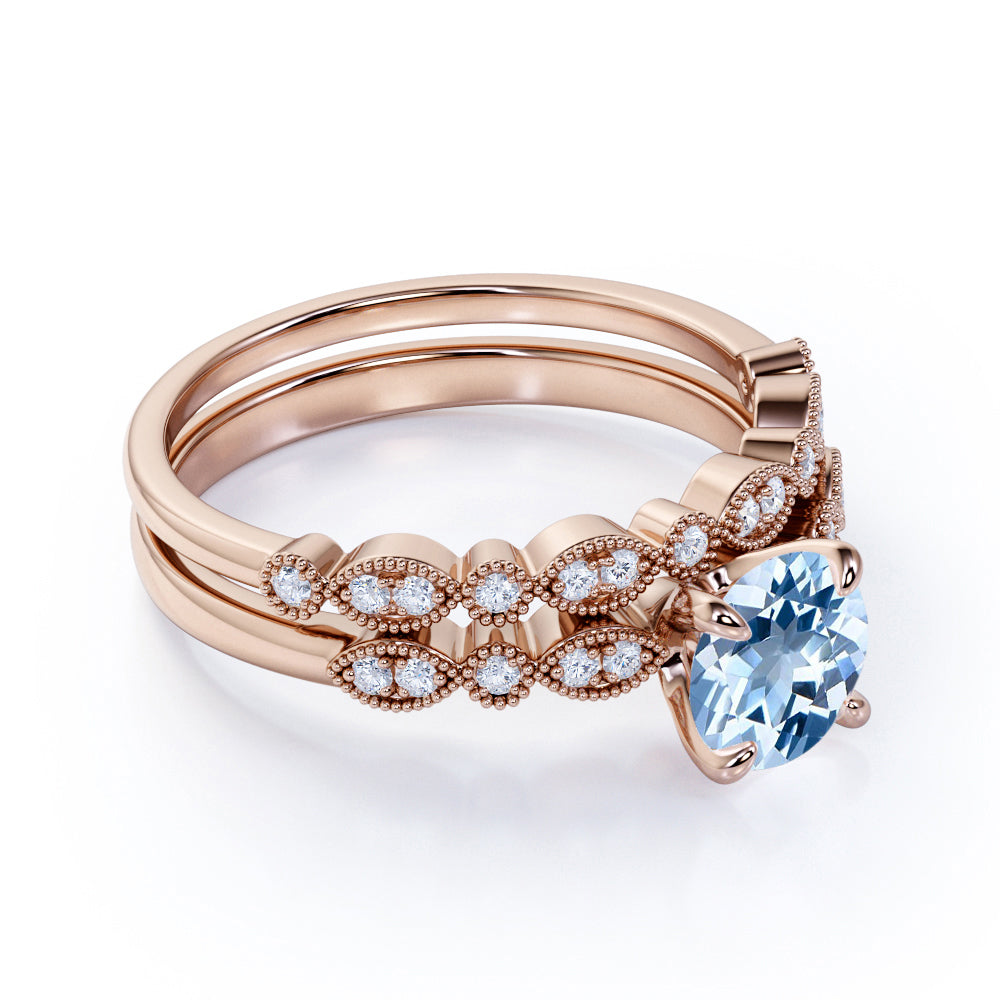 Art Deco 1.50 ct Round Aquamarine Bridal Ring Set