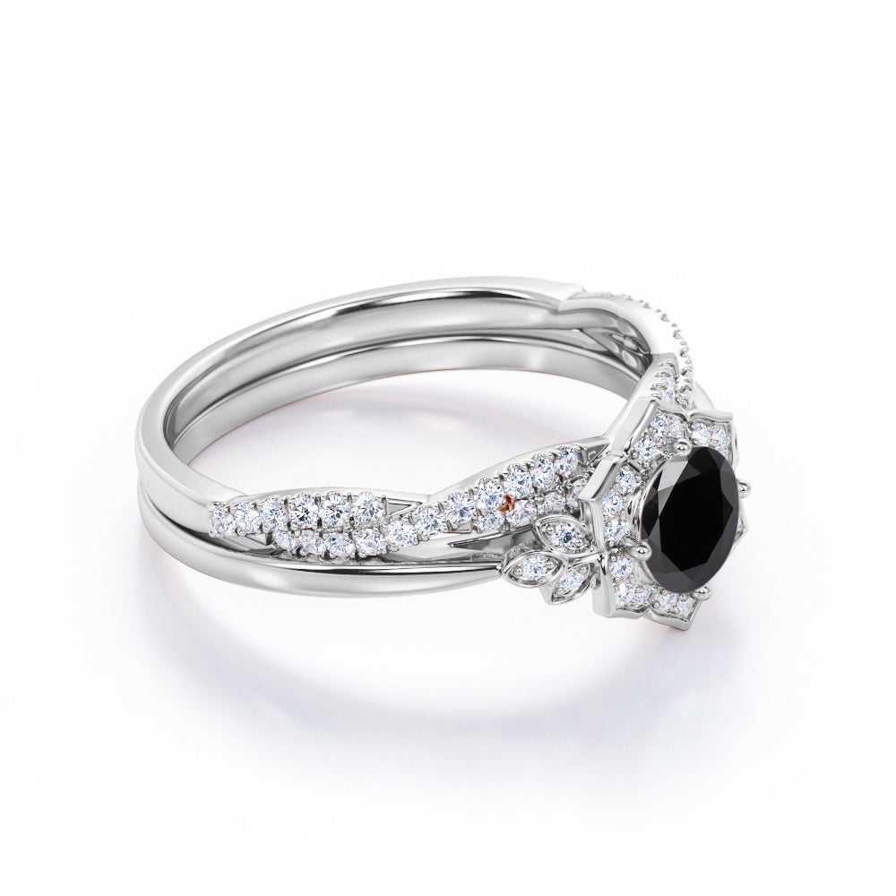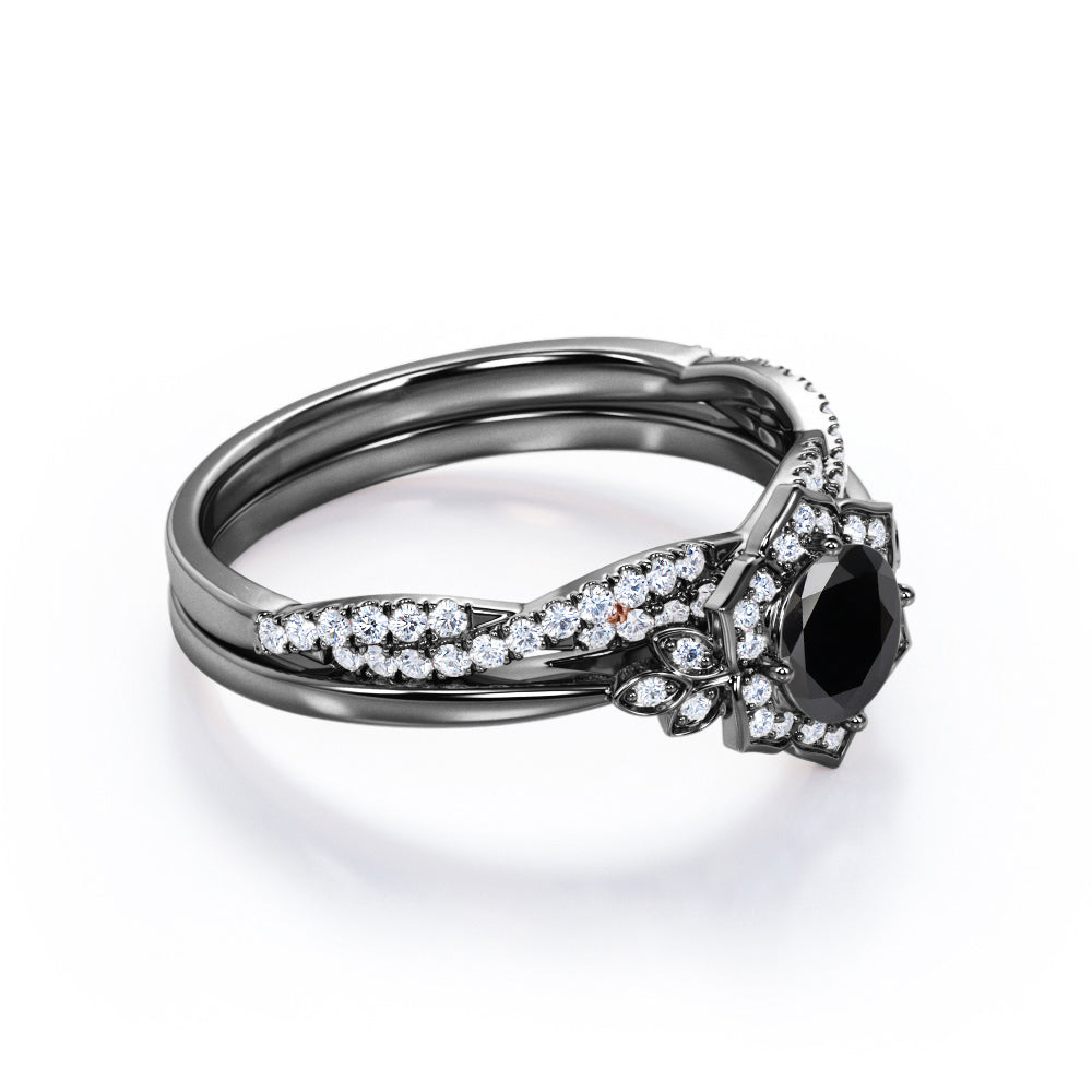 1.50 carat round cut Black Diamond vintage art deco wedding ring set in white gold. Looking for something different? Our Black Diamond vintage art deco wedding ring set might be the one that you are in search of. This round cut vintage wedding set comes with a matching infinity wedding band to complete your look. The art deco work on the ring is adds more charm to this wedding set. This vintage wedding set features one engagement ring with 1 carat Black Diamond and .25 carat diamonds which comes with a wedding band embezzled with diamonds of .25 carats. Grab this divine wedding ring set to glam up your look. This 1.50 carat round cut Black Diamond vintage art deco wedding ring set in white gold can also be customized to 10k Gold, 14k Gold.