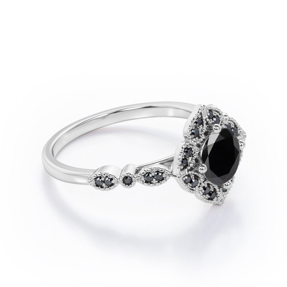 Be highly fashionable with this Milgrain Flower Cluster 1.5 TCW Round Brilliant Cut Lab Created Black Diamond Filigree Engagement Ring in White Gold. Professionally handcrafted into a fine round cut by our skilled jewelers, this astonishing black diamond stone ring is made up of total 1.5 carat lab created black diamond on solid white gold. Special and non-traditional, this black diamond engagement ring is well-suited for those who are not quite into normal lifestyle. Reflective properties of this black diamond ring will absolutely enhance every style of its wearer. This black diamond ring is beautiful and accessible since it is available at an affordable price. If you are looking for a special gift for your friends or your better half, this synthetic black diamond ring can definitely help you out. Additionally, this black diamond ring can be customized, so customers can choose one of metal colors between white gold, rose gold, yellow gold or black gold in 10k and 14k gold metal options. Let's fulfill your love story with this black diamond and, surely, she will not regret it.