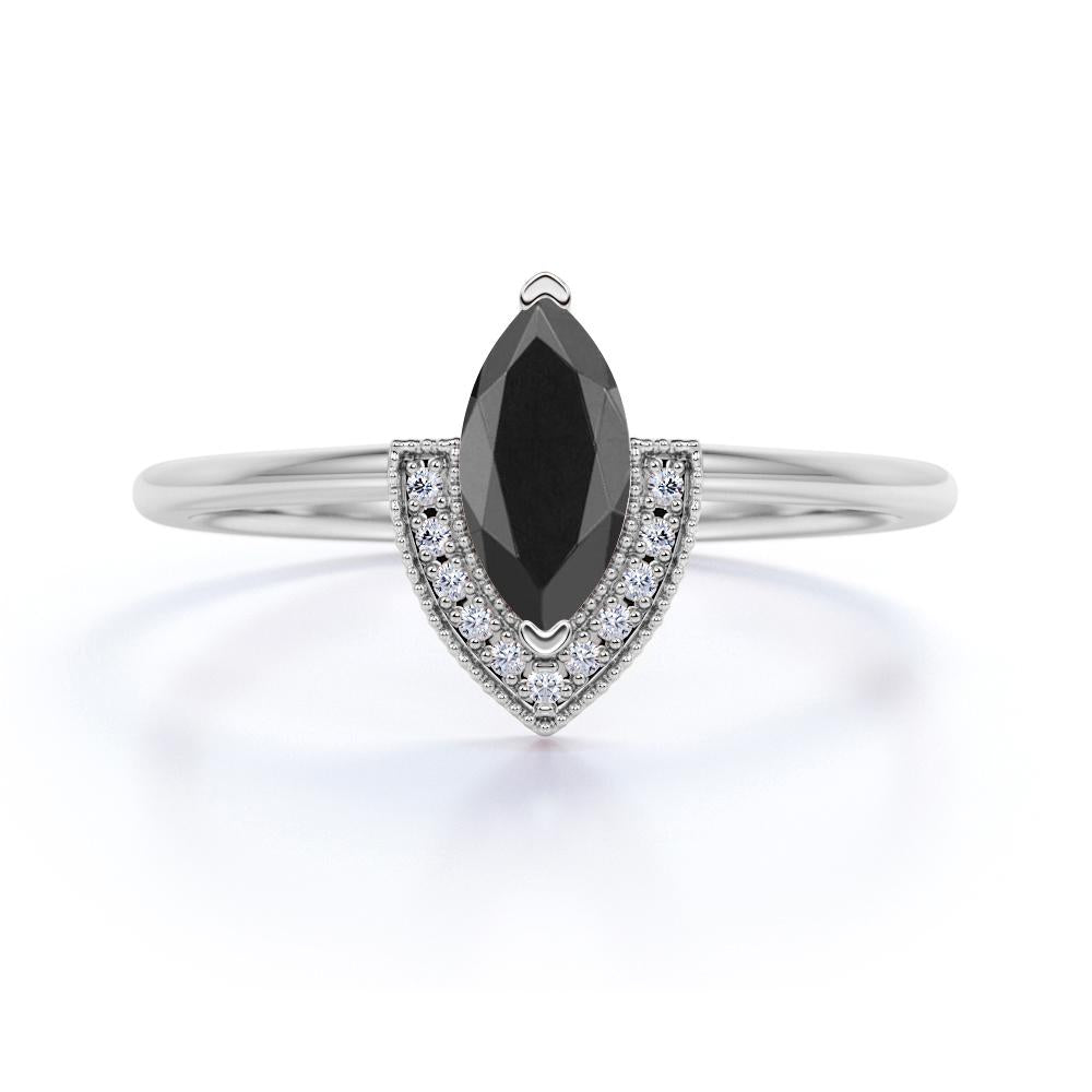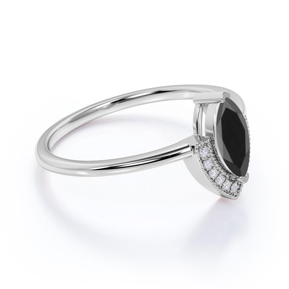 V shaped Style 1.25 Carat Marquise Lab Black Diamond and Vintage Engagement Ring in White Gold