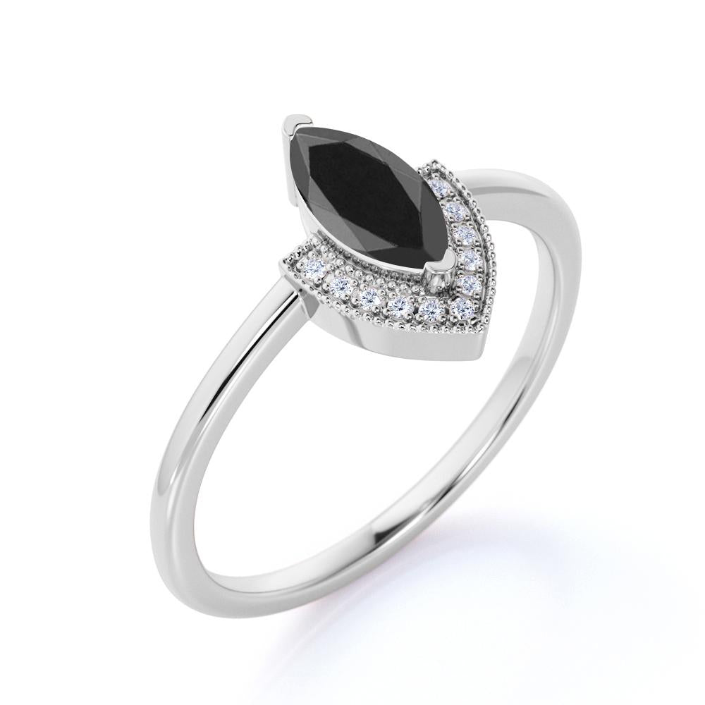 All of our rings are genuine, real and authentic. Perfect for valentine, mother's day, anniversary gift and at a very reasonable prices. This black diamond ring is also considered the new vintage art deco engagement ring, because of its art deco style that is unique and one of a kind ring design. This black diamond ring features an approximately 1 carat marquise shaped lab created black diamond, surrounded by .25 carat natural side diamonds, for a total weight of 1.25 carats.