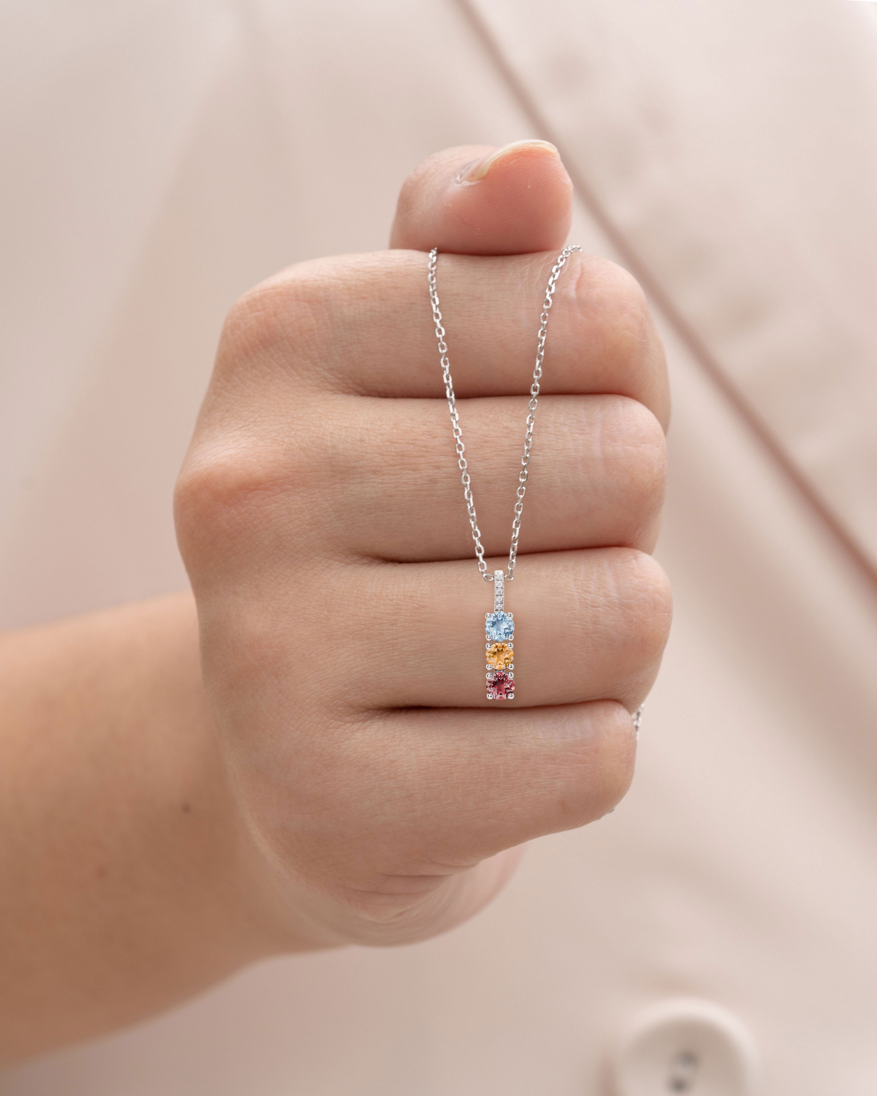 Celebrate your unique style with our Perfect Vertical Multi Birthstone and Moissanite Bar Pendant Necklace for women in 18k white gold over silver. This exquisite piece of affordable, handmade jewelry is a true embodiment of elegance and individuality. Featuring a vertical bar pendant adorned with multiple birthstones of your choice, this necklace allows you to personalize it with gemstones that hold special meaning to you. Whether you prefer vibrant sapphires, mesmerizing emeralds, or any other gemstone that resonates with your spirit, this necklace becomes a unique symbol of your personal journey. Not only can the gemstones be customized, but the 18k gold plating can also be tailored to your preference. Choose between the colors: yellow gold, rose gold, or black gold, adding a personalized touch, ensuring a ring that perfectly suits your personal style. Handcrafted with meticulous care and attention to detail, this pendant necklace showcases exceptional artistry. The combination of the birthstones and the sparkling brilliance of the moissanite stones creates a captivating visual display, making it an eye-catching accessory for any occasion. Celebrate your individuality with our Perfect Vertical Multi Birthstone and Moissanite Bar Pendant Necklace for women in 18k white gold over silver. This extraordinary piece offers affordability, handmade craftsmanship, and the freedom to customize gemstones and gold plating, resulting in a necklace that beautifully reflects your unique personality and story.