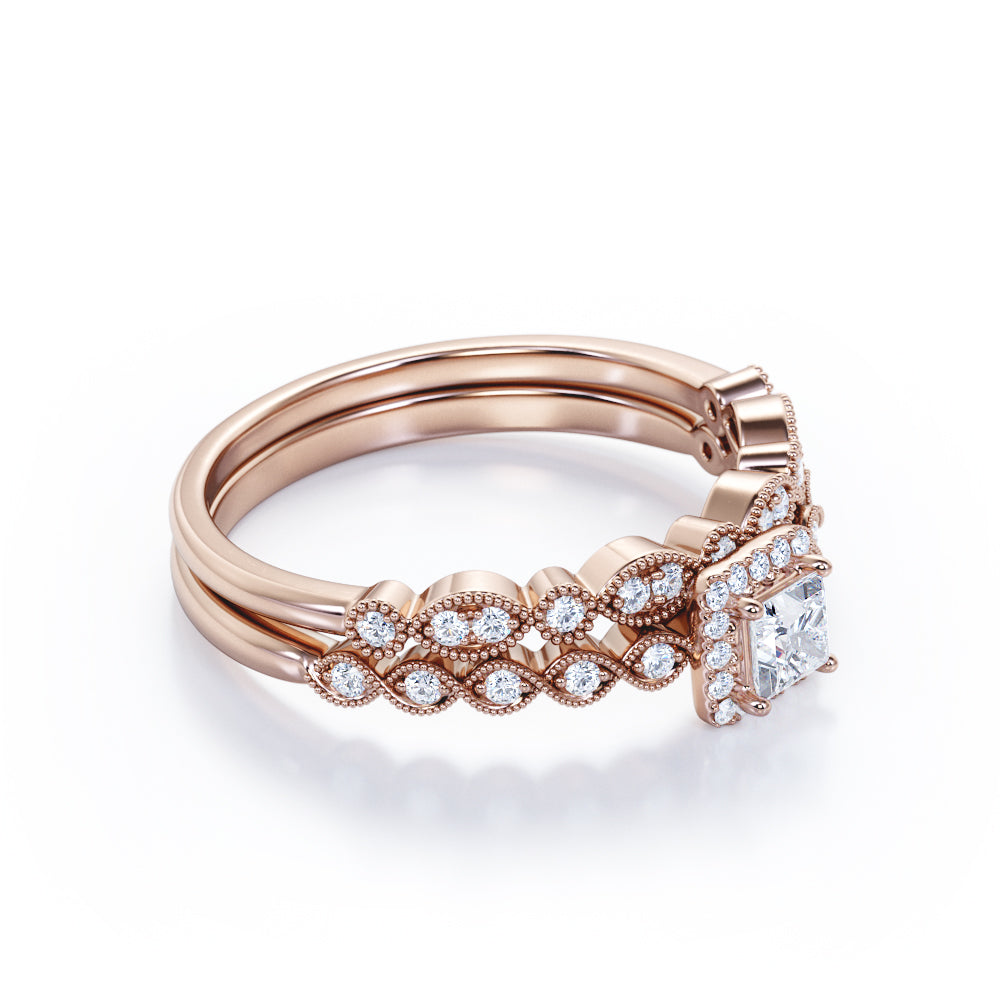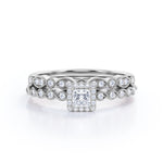 0.65 carat princess cut diamond vintage wedding set in white gold. Struggling to find the perfect bridal ring for your big day? Your struggle ends here, get this graceful diamond nature inspired wedding ring set in white gold.The wedding set comes with an engagement ring with 0.25 carat princess cut diamond at the center which is surrounded by 0.40 carat side diamonds including the matching wedding band. This vintage wedding set is surrounded by the art deco design. This art deco style wedding ring set will do all the justice to your everlasting love story. This 0.65 carat princess cut diamond art deco inspired wedding ring set in white gold can also be customized to 10k Gold, 14k Gold or 18k Gold as per your willingness.