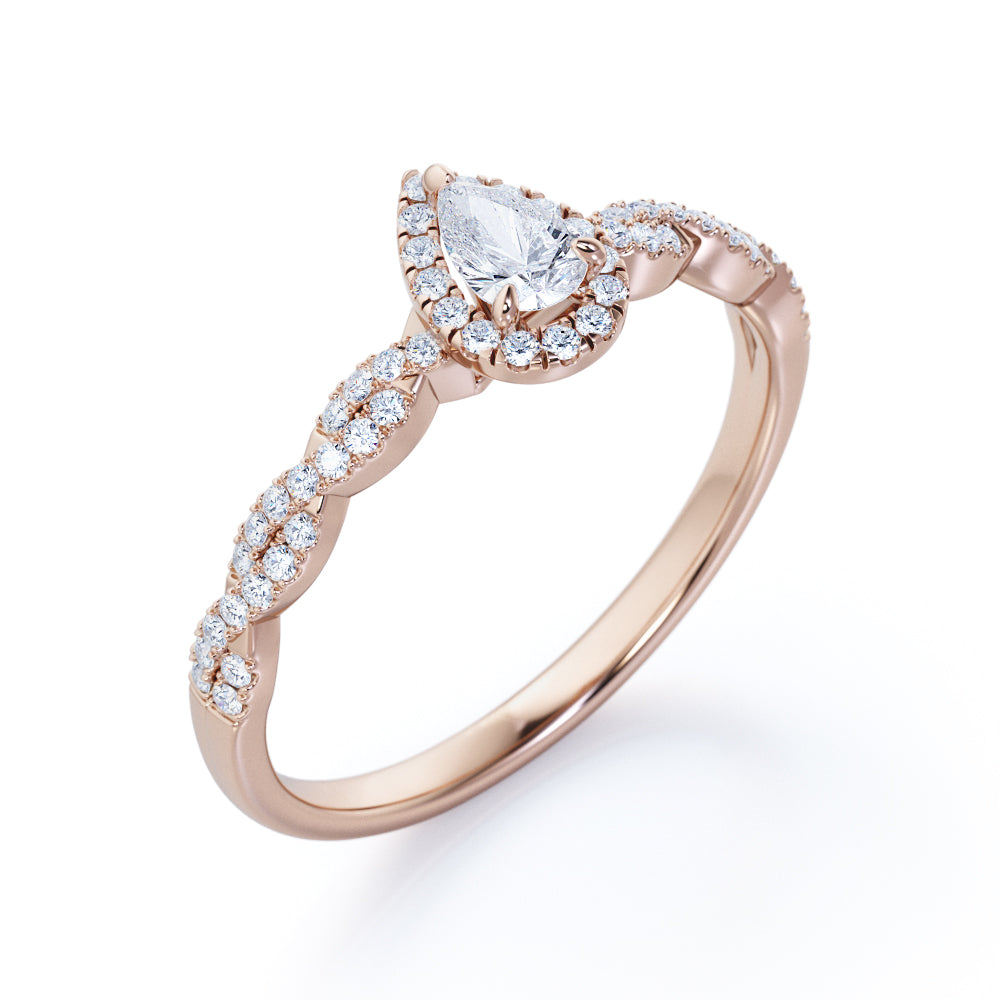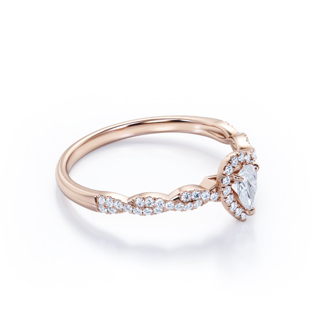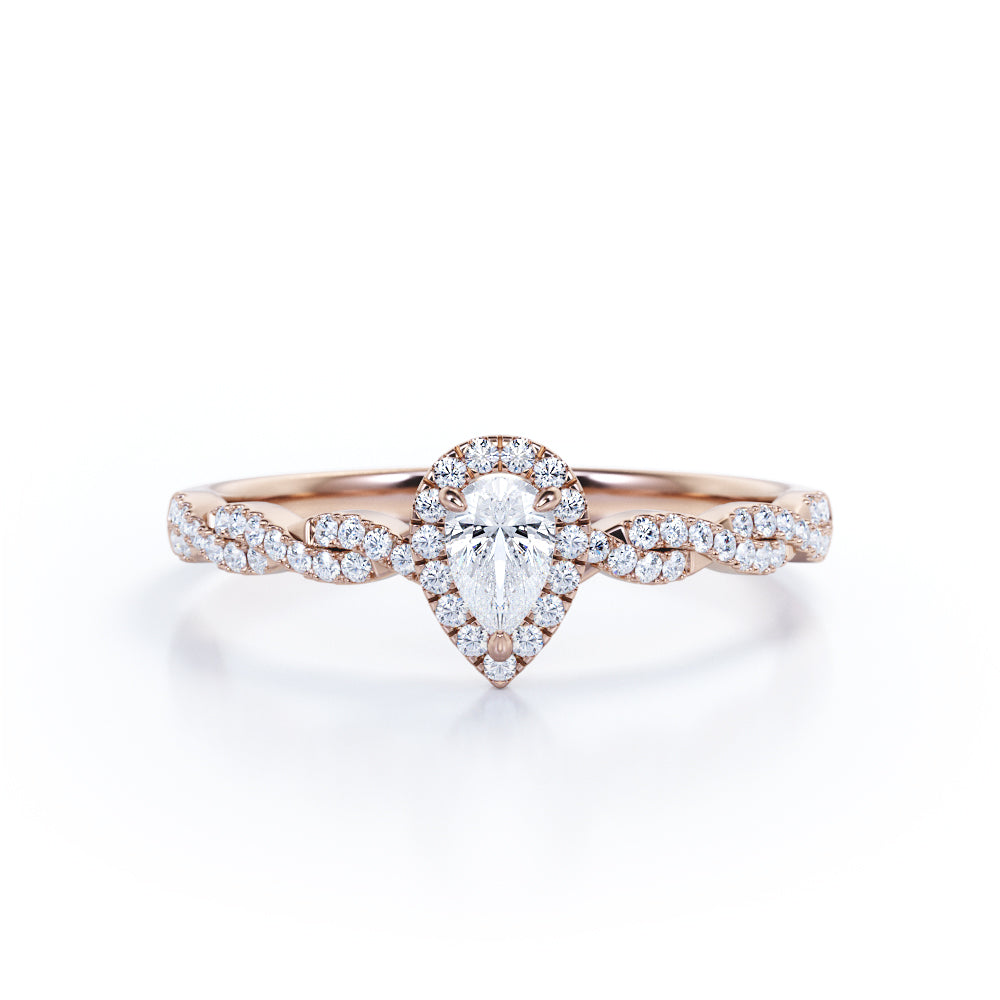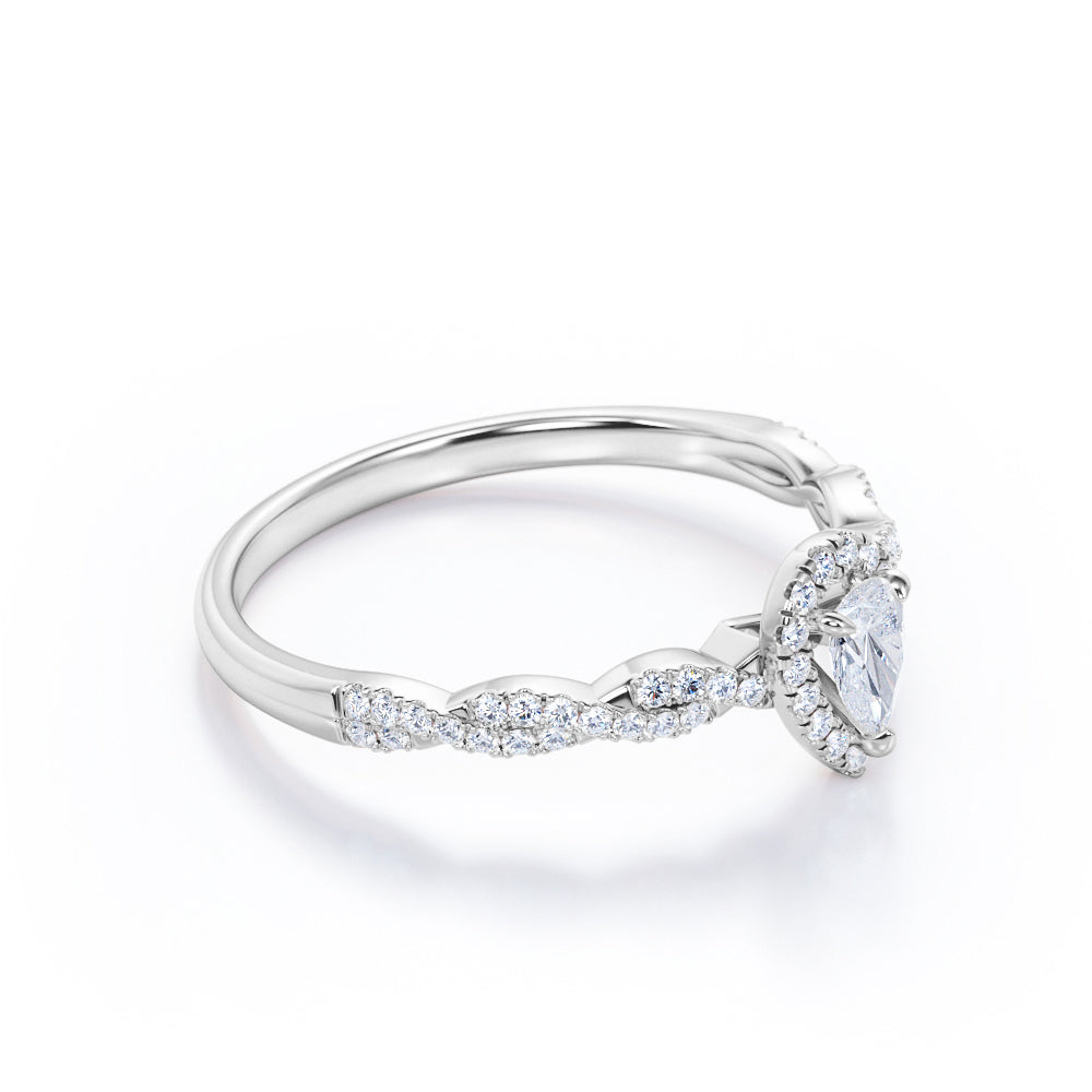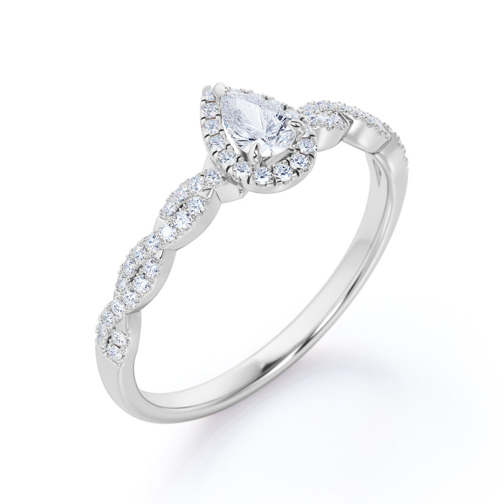 1 Carat Pear Cut Certified Lab Diamond Infinity Engagement Ring in White Gold for Her. This regal engagement ring features a 0.33 carat pear-cut Certified Lab Diamond, surrounded by 0.7 carat side Moissanites for a total weight of 1 carat. The infinity design flows effortlessly around the finger, with pave set Certified Lab Diamonds exhibiting brilliance and sparkle. Handmade by our artisans, it can be customized to 10k, 14k, or 18k gold. Perfect for symbolizing eternal love, this ring adds a touch of elegance to any occasion. Make a lasting impression with this exquisite piece. The order includes a 30-day full refund policy, 30-day free resizing, and a limited 6-month warranty.