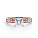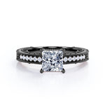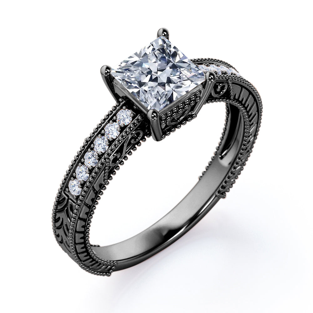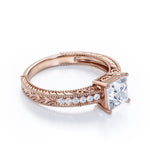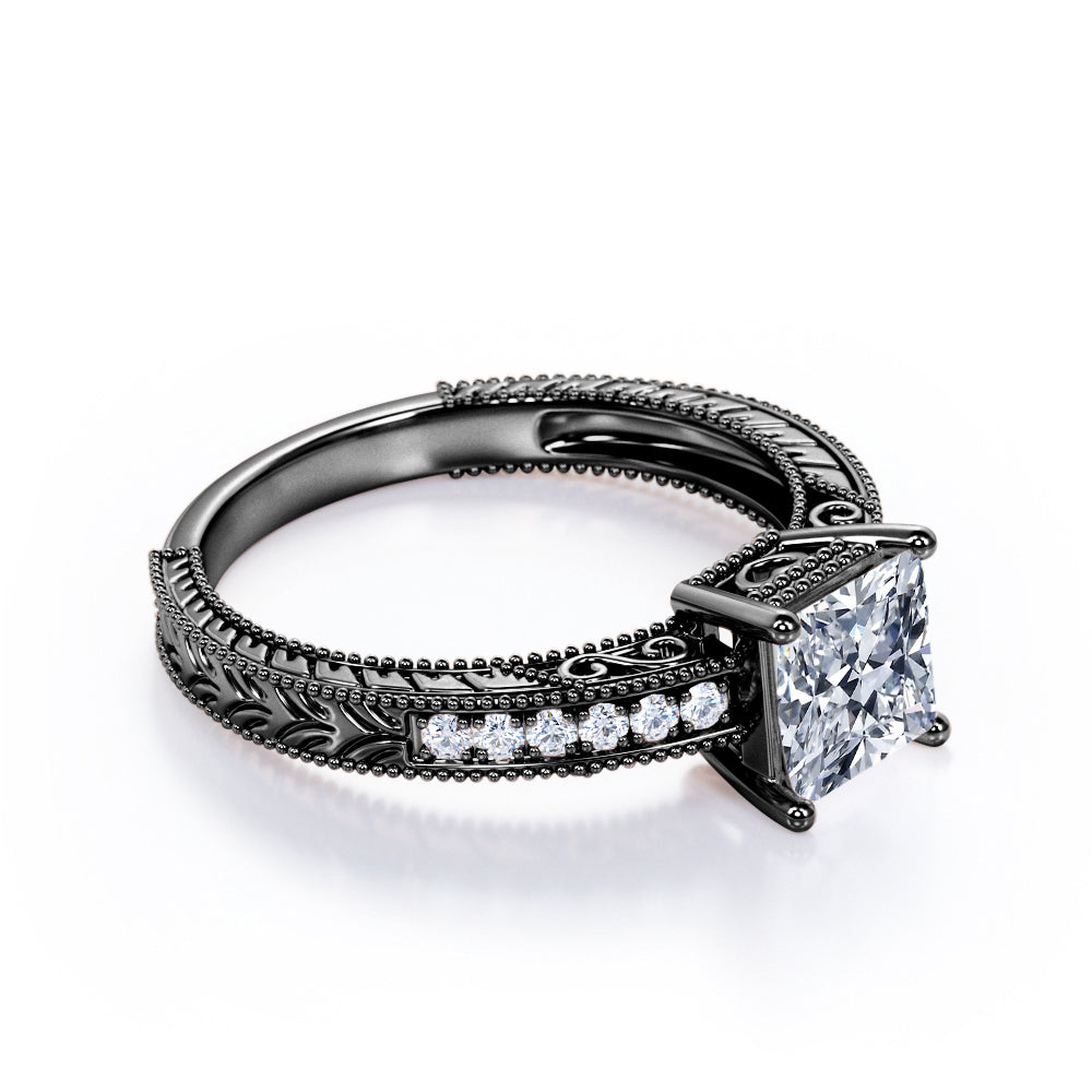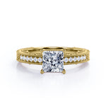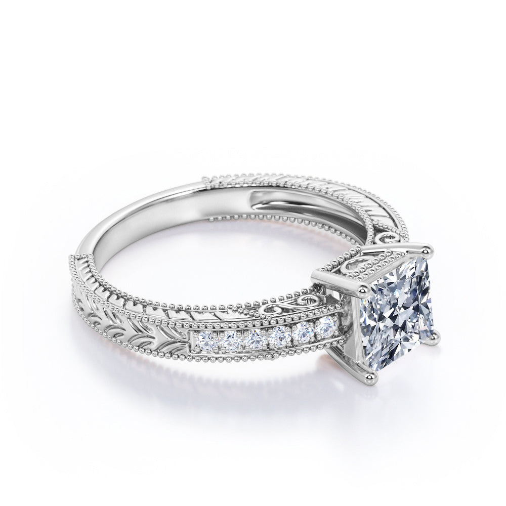 Art Deco Pave Set 0.50 Carat Princess Cut Diamond Vintage Milgrain Engagement Ring In White Gold. Pure elegance, right this way. For a vintage aesthetic and one-of-a-kind feel, we recommend this standout engagement ring with art deco flair. Between the petite vintage milgrain edges and the perfectly placed square cut diamond, this diamond engagement ing is the epitome of timeless. This princess cut diamond ring in white gold features 0.33 carat diamond in the center and 0.17 carat of sizzling side diamonds. The detailed milgrain edging and art deco work in the band lends a vintage appeal to this elegant engagement ring. You will surely be intrigued by this regal piece with pave set diamonds on it. You are absolutely going to love this. Handmade with utmost love and care, this art deco pave set 0.50 carat princess cut diamond vintage milgrain engagement ring in white gold can also be customized to 10k Gold or 14k Gold as per your preference.