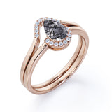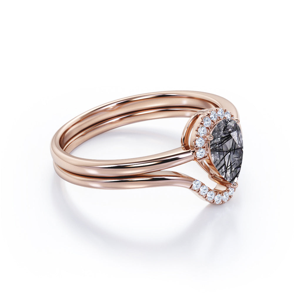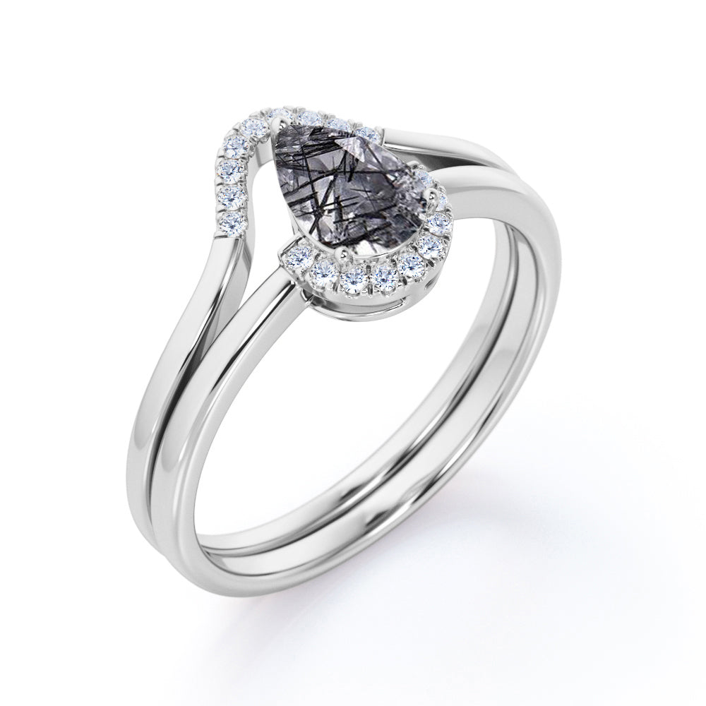 Create an incredibly beautiful look on her finger with this Lovely Modern Half Bezel 1.75 Carat Teardrop Shape and Diamond Contour Curved Pave Band Bridal Set Rings - Wedding Ring Sets. This unique dendritic rutilated quartz ring features 1.25 carat pear cut real rutilated quartz and .50 carat genuine side diamond for gold ring and moissanite for silver ring. This beautiful bridal sets can be customized to either 10k, 14K and Gold over Silver and either Black Gold, Rose Gold, White Gold or Yellow Gold. Also, as your satisfaction is our most priority, we will do our best to have your handmade jewelry be carefully and beautifully crafted by our expert jewelers. The order also comes with a 30-day full refund policy. This clear crystal with black needle inclusions ring will surely be a perfect gift for your significant other. It is believed to attract a good match, increase appeal, and fascinate with your own personality. This tourmalinated black rutilated quartz is believed to be a protection against the ill thoughts of others. Own this ring which displays a combination of quartz and rutile that creates an amazing vibration and stand out from the rest. This rutilated crystal quartz ring is a very perfect alternative to those traditional ring because of its incredibly beautiful needle inclusions. Create a fascinating look on your finger with this black rutilated crystal quartz ring which is available in both solid gold and sterling silver. It perfectly fits those who are looking for a very unique ring that no two rings are alike because of its distinctive needle inclusions. Crowned as a powerful heeling stone, this rutilated quartz ring enhances will-power and determination of its wearer. Embellish her finger with this ring which is perfect for any occasion and everyday wear. With its mesmerizing patters of colors and inclusions, this rutilated quartz ring will enchant your special someone with gracefulness.