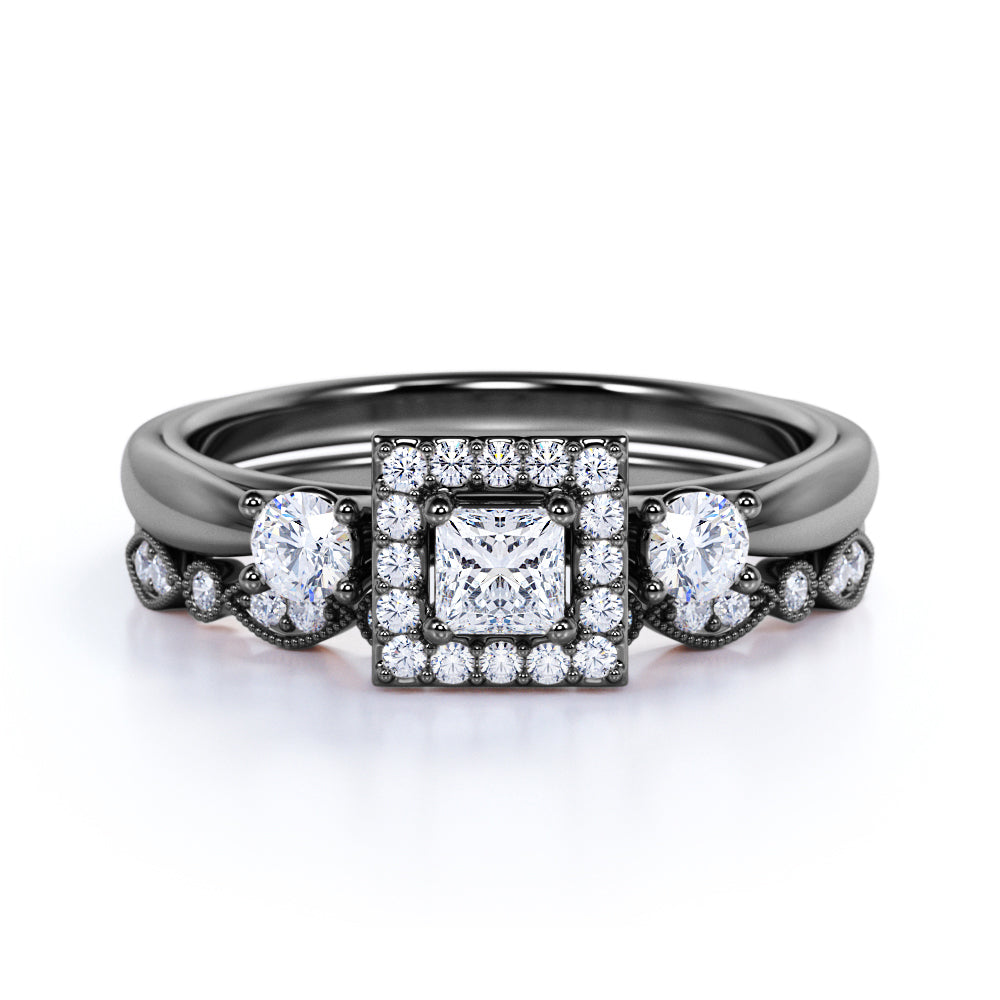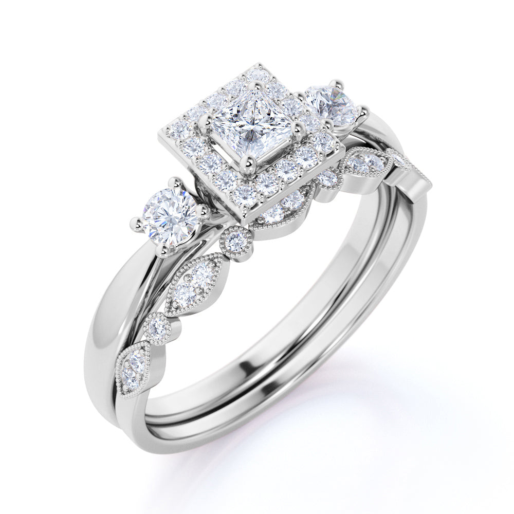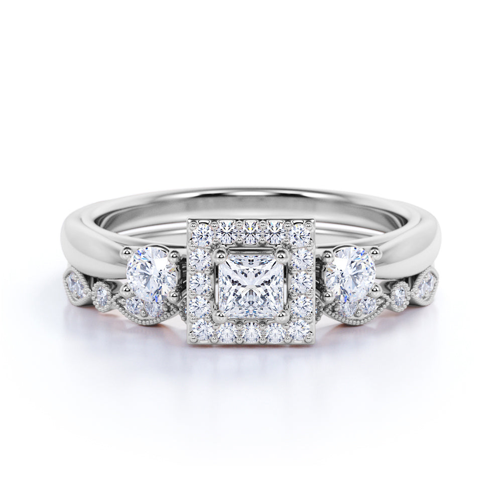 3 Stone Cathedral Modern Art Deco 1 ct TDW Princess Cut Diamond Milgrain Bridal Set - Wedding Set - 10K White Gold