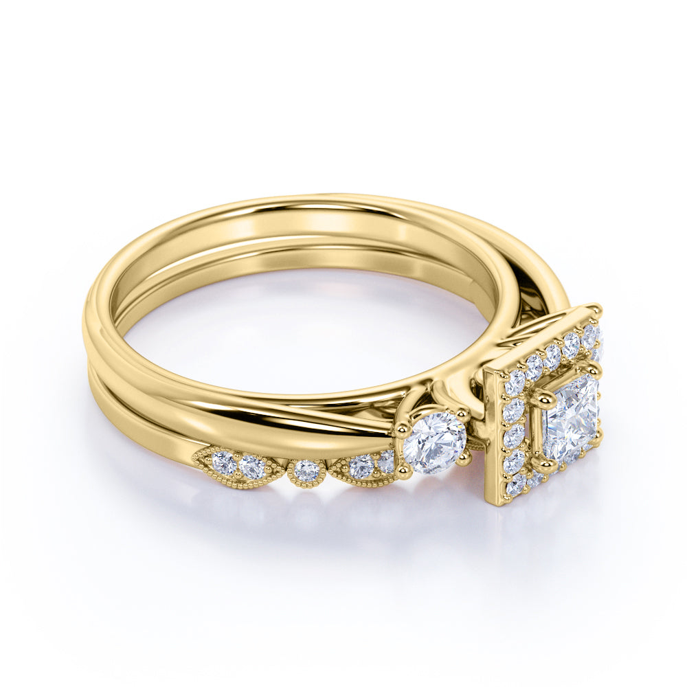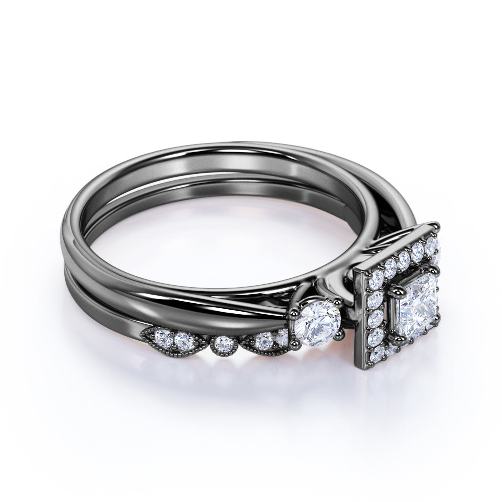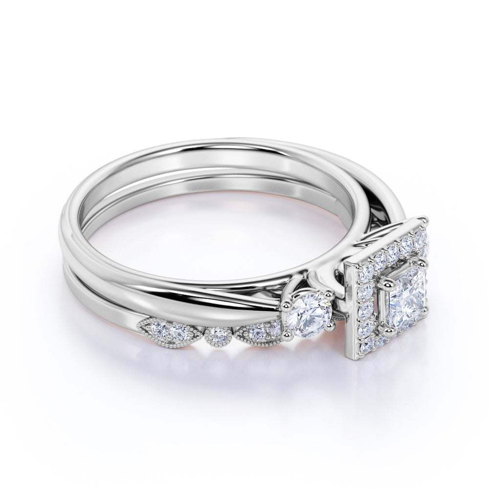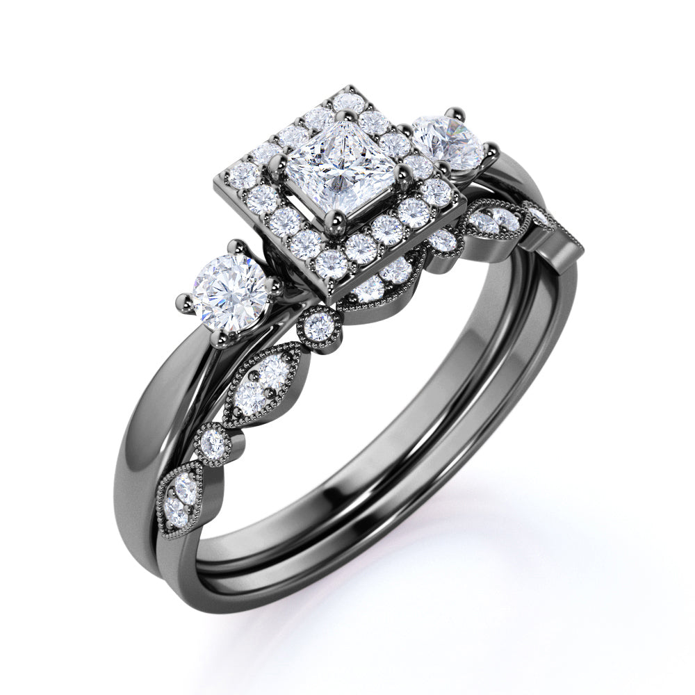3 Stone Cathedral Modern Art Deco 1 ct TDW Princess Cut Diamond Milgrain Bridal Set - Wedding Set - 10K White Gold