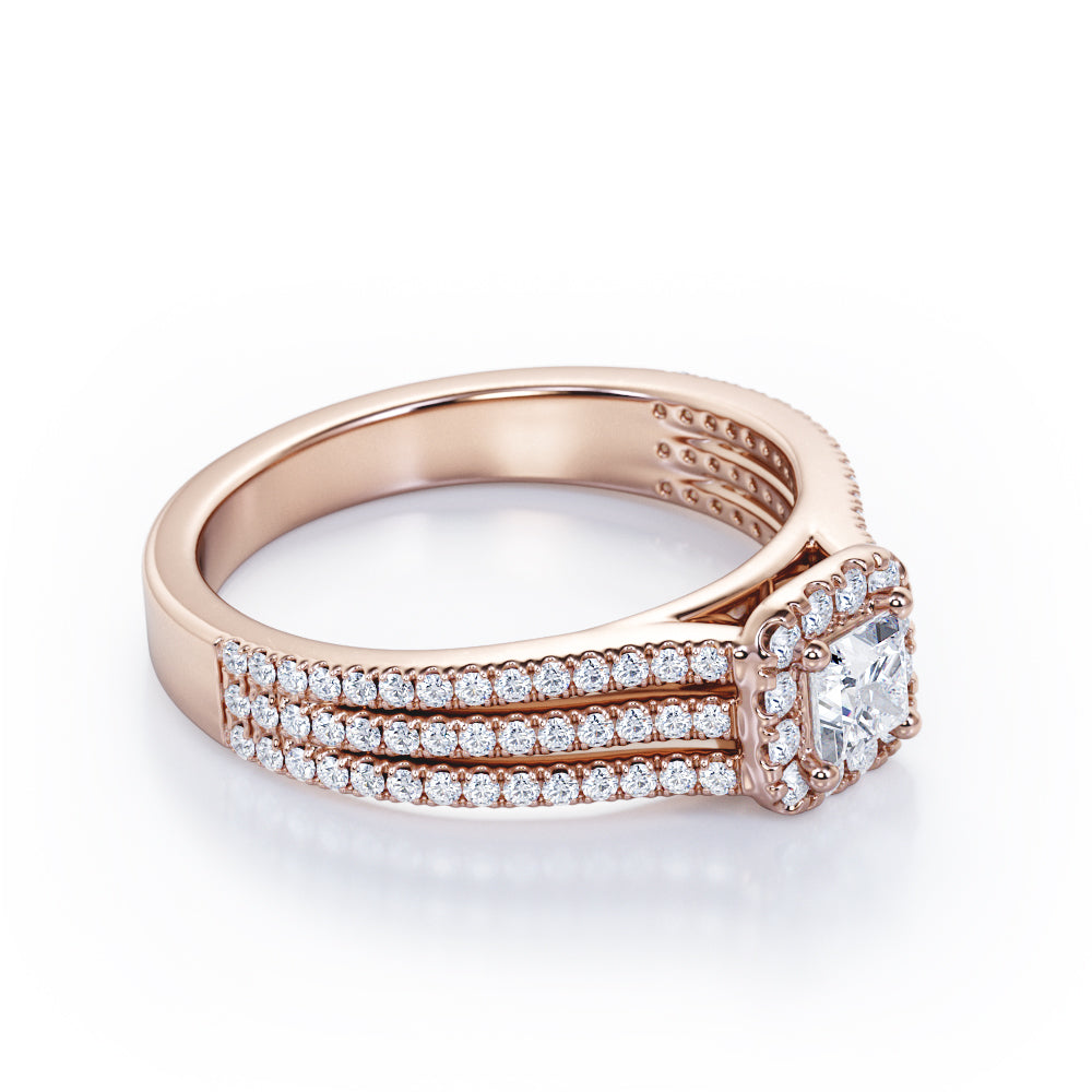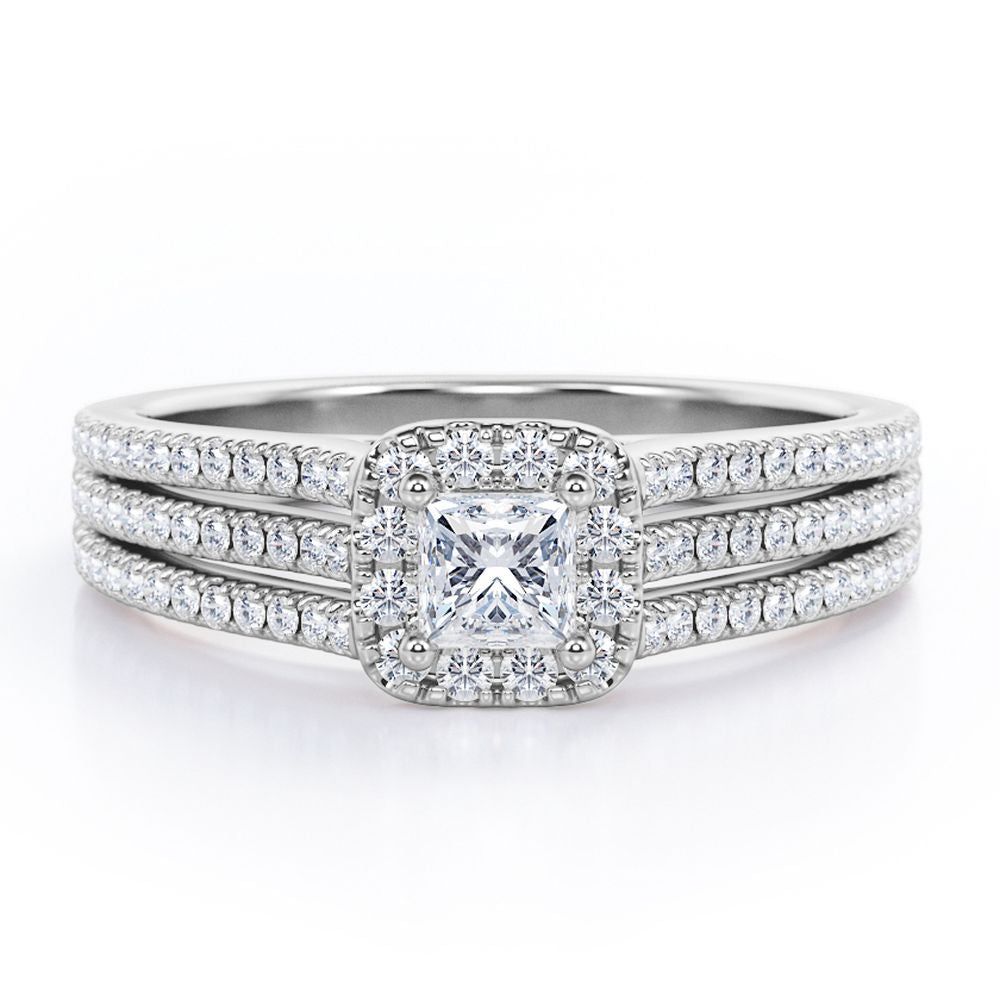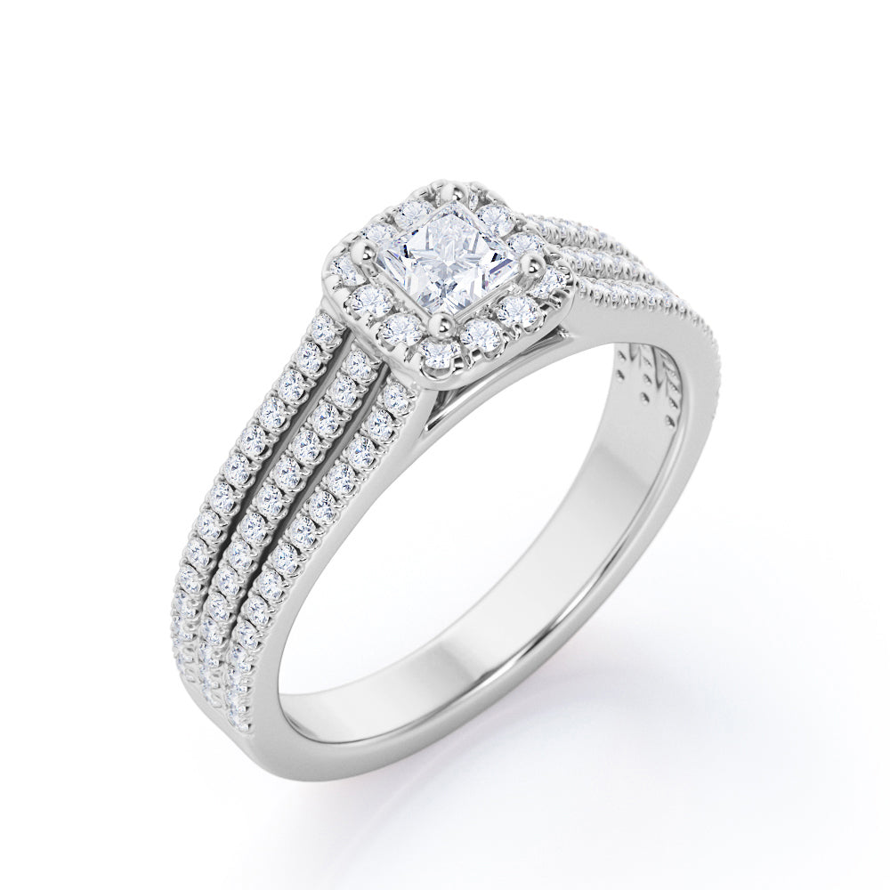 Triple Split-Shanked Pave - 0.55 TCW Princess Cut Diamond - Halo Engagement Ring - 10K White Gold
