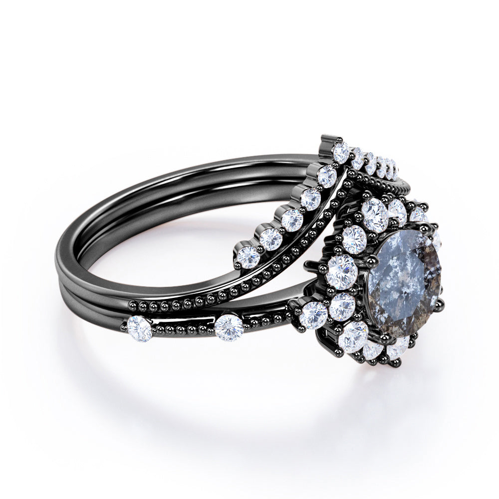 Vintage Filigree 1 Carat Brilliant Round Cut Icy Grey Salt And Pepper Diamond V shaped Halo Wedding Ring Set In White Gold. If you are an old soul vintage lover kind of person, then our exclusive natural icy grey salt and pepper diamond engagement ring would be and absolute perfect choice. Set in a cluster of smaller diamonds, this brilliant round cut salt and pepper diamond with quirky colors and inclusions is unique on its own. This halo ring is perfect for vintage lovers with the filigree and beaded art work around the band. This vintage inspired wedding ring set features 0.70 carat natural salt and pepper diamond as the center stone and 0.30 carat of glistening white round cut diamonds inclusive of the matching V shaped wedding band to complement you in any ensemble. Handmade with utmost love and detailed attention, this vintage filigree 1 carat brilliant round cut icy grey salt and pepper diamond V shaped half wedding ring set in white gold can also be customized to 18k Gold plating over silver, 10k Gold or 14k Gold as per your preferred choice.