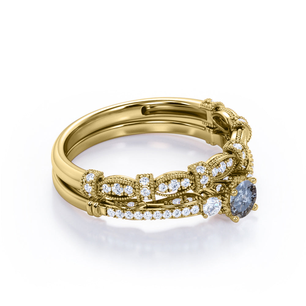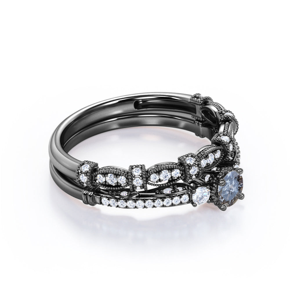 Vintage Milgrain 0.65 Carat Round Cut Genuine Salt and Pepper Diamond Three Stone Wedding Ring Set In White Gold