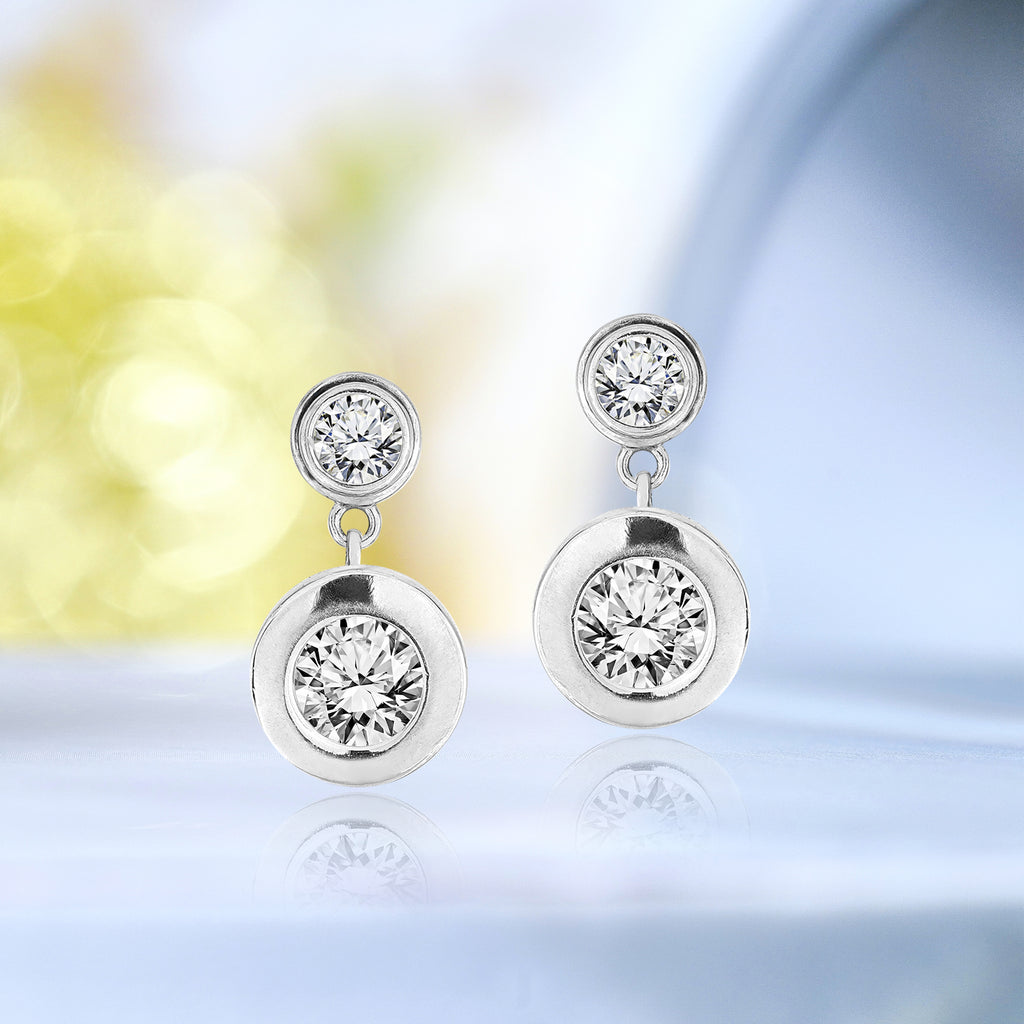 Sparkling 2.5 Carat Double Round Cut Stone - Bezel Set - Women's Dangle Earrings in Silver