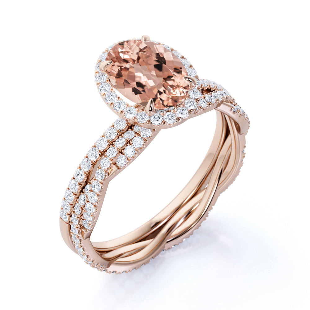 Antique 1.75 Carat oval cut Morganite and Diamond Bridal Wedding Ring Set in Rose Gold