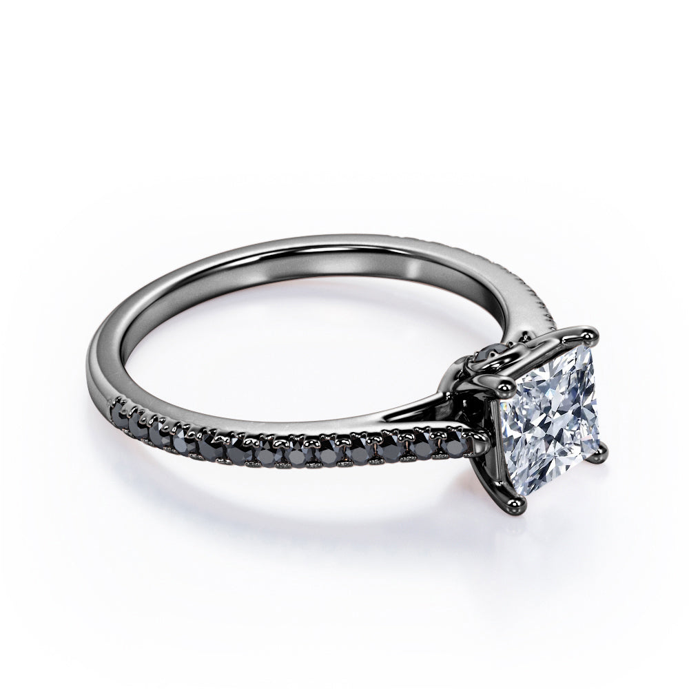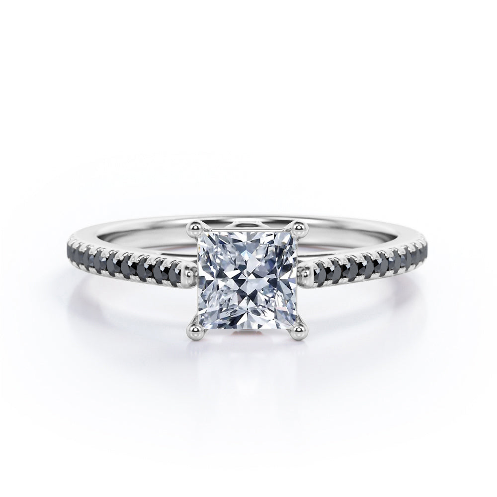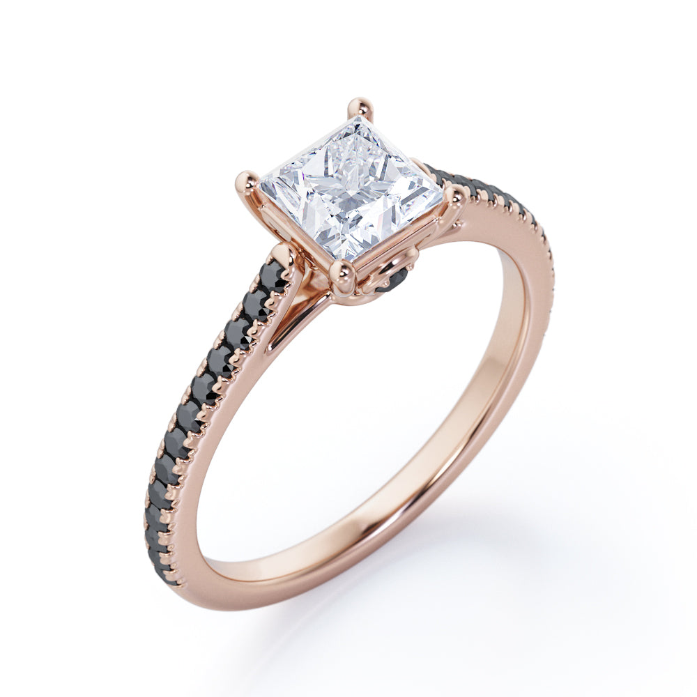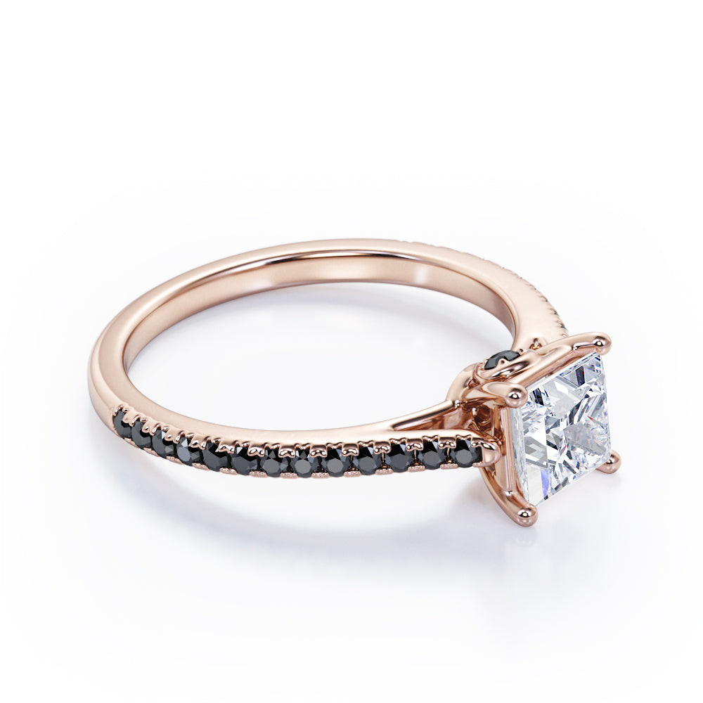 1.25 TCW Princess Cut Moissanite with Lab Created Black Diamond - Pave Setting - Prong Engagement Ring in Rose Gold
