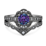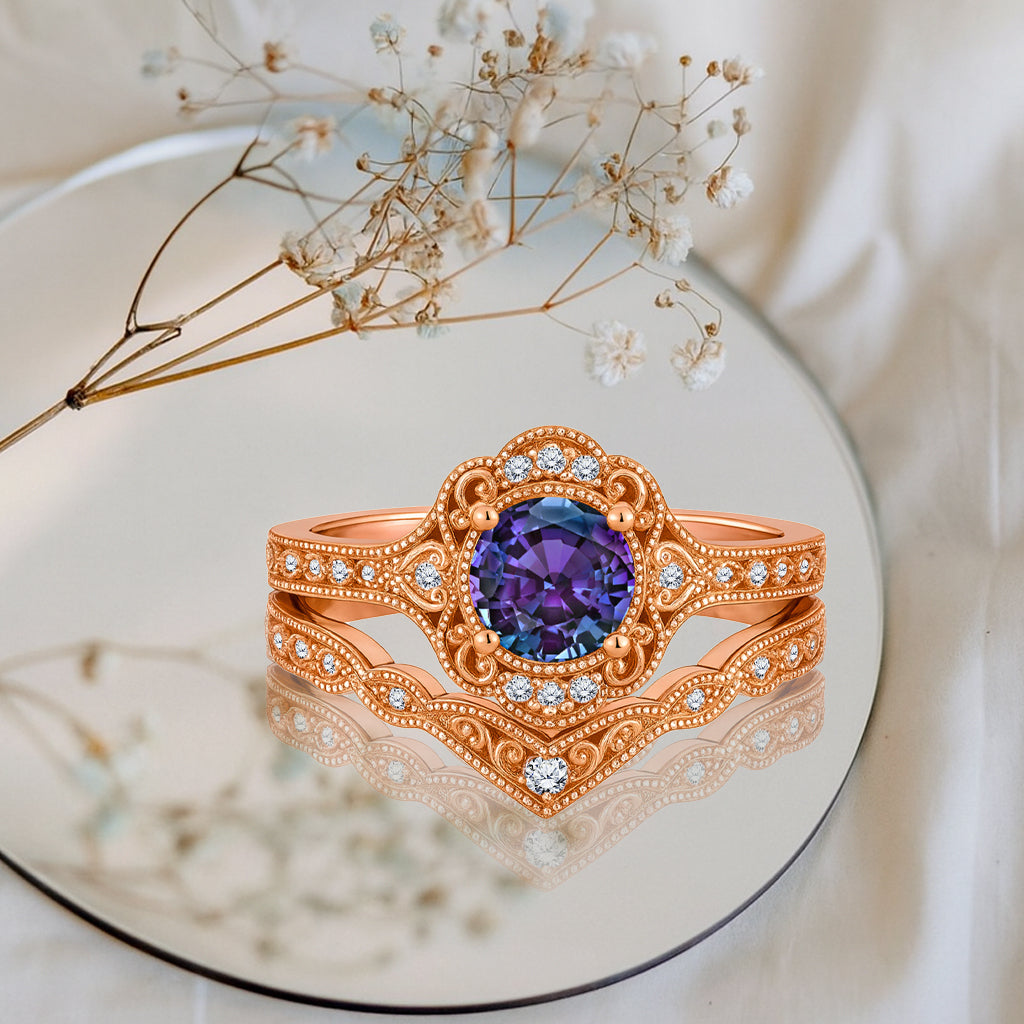 1.20 Ct Round Vintage Alexandrite Milgrain Bridal Ring Set