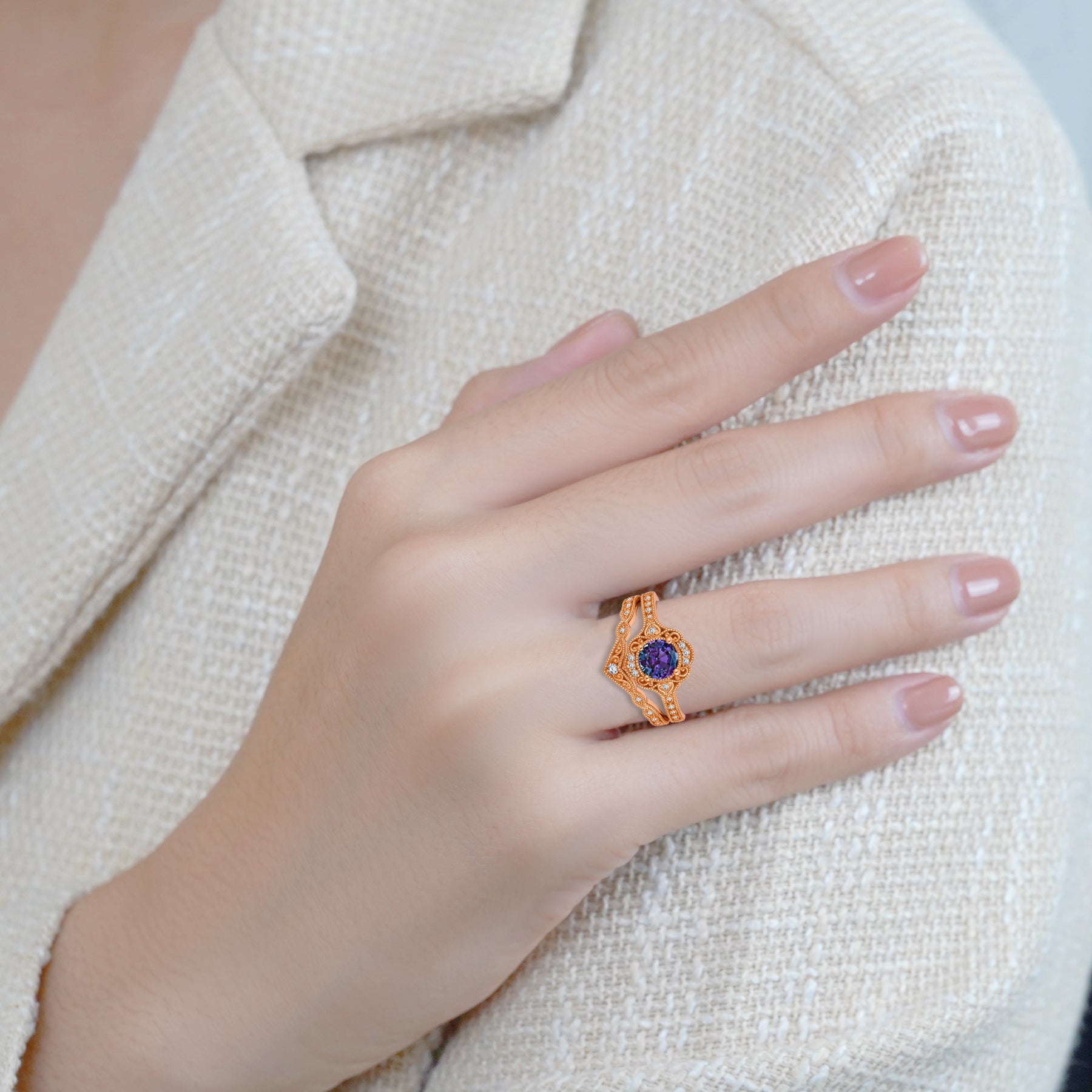 Intricate milgrain and scrollwork detailing give this set its heirloom charm, while the bold alexandrite centerpiece makes it a symbol of love as rare as the wearer. Perfect as an engagement and wedding set, this ring embodies elegance, passion, and eternity.