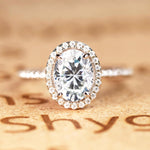 1.25 Carat oval cut Moissanite Halo Engagement Ring in 18k White Gold Over Silver.The ring is made with real and high quality Moissanites that can be a perfect alternative to diamond rings as moissanites have almost the same durability and quality as with diamonds that will last for a lifetime. The order comes with 30 Days Full Refund policy. The moissanite engagement ring is perfect gift for anniversary, birthday, mothers day, or any other special occasion to celebrate.