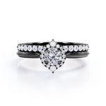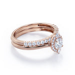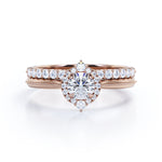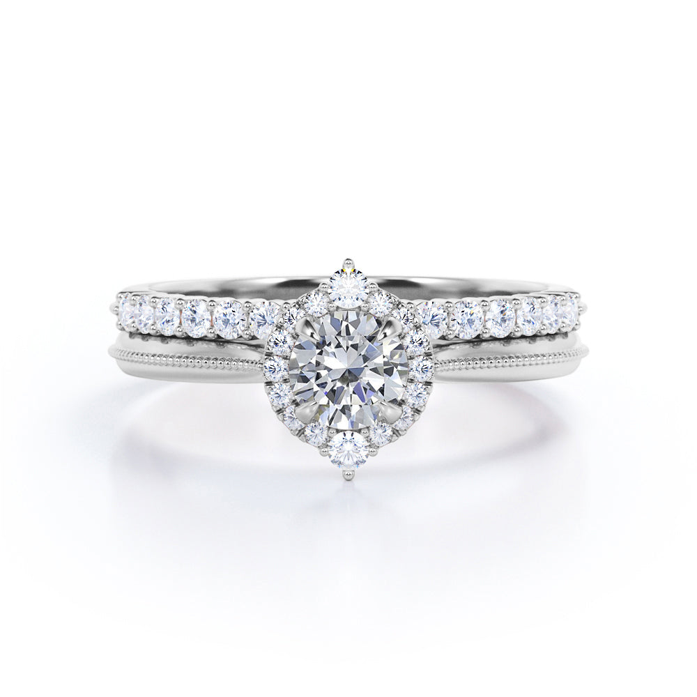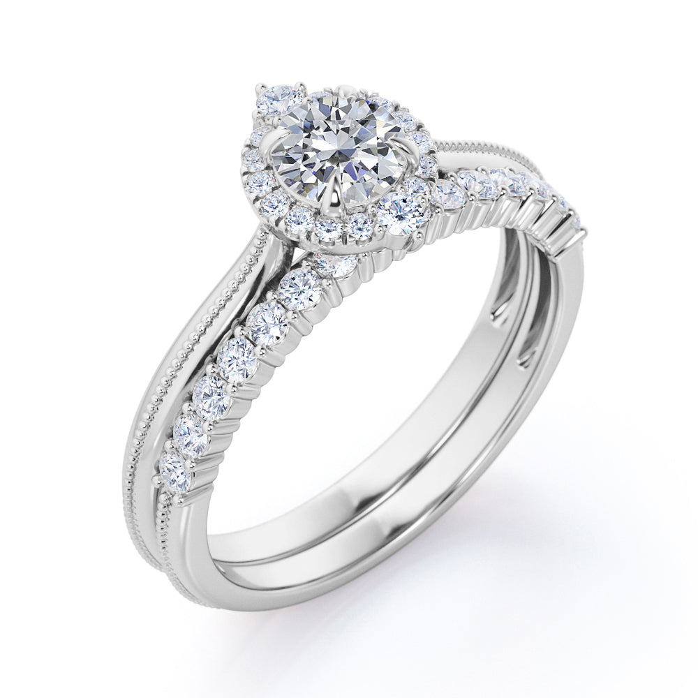 1.25 carat round cut Moissanite and diamond filigree bridal set in white gold. Glow up in our classic Moissanite and diamond bridal set made in real white gold. The bridal set comprises of one engagement ring and a matching wedding band. The engagement ring consists of 1 carat Moissanite and surrounded by sizzling .25 carat of diamonds. Complete your vows with this vintage style ring and make your love story as antique as this wedding ring set is. The vintage filigree style adds a certain loveliness to the ring. Choosing the right wedding ring is very important as it will express your love and stir feelings of joy that will be unforgettable. This 1.25 carat round cut Moissanite and diamond filigree bridal set in white gold can also be customized to 18k Gold plating over silver, 10k Gold, 14k Gold or 18k Gold.