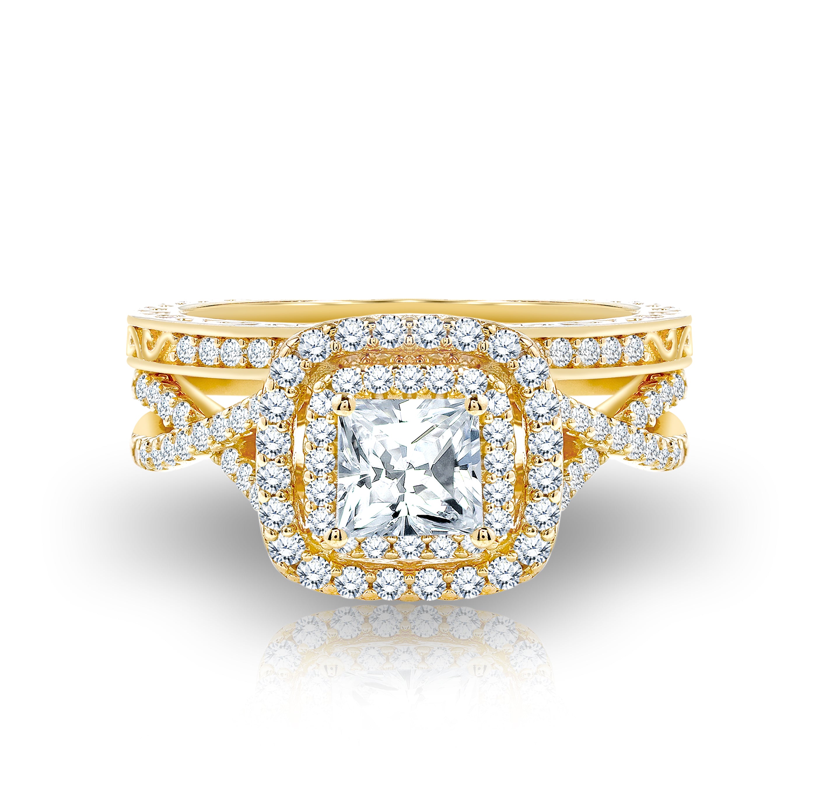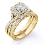 1.25 ct - Square Moissanite - Double Halo - Twisted Band - Vintage Inspired - Pave - Wedding Ring Set in 10K Yellow Gold