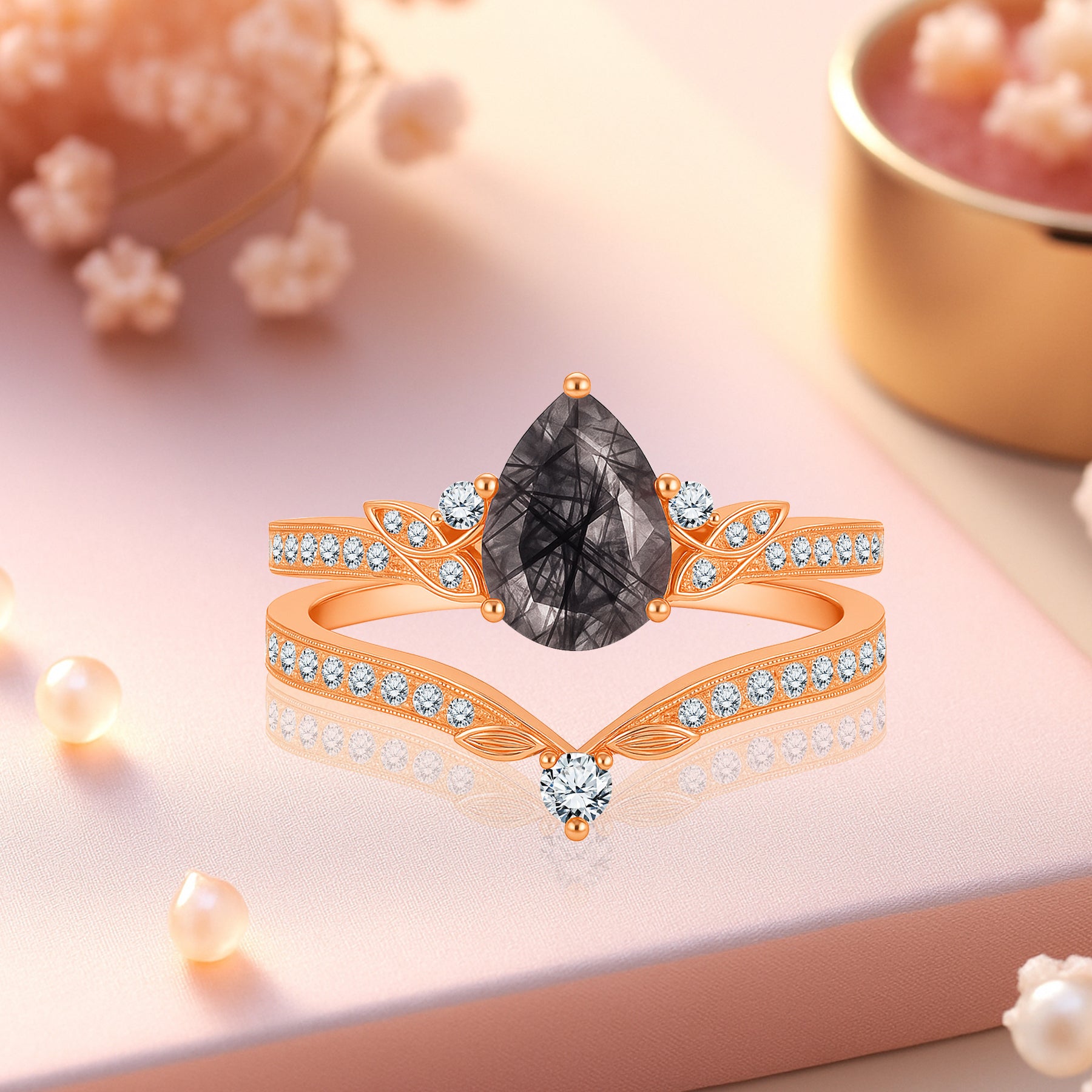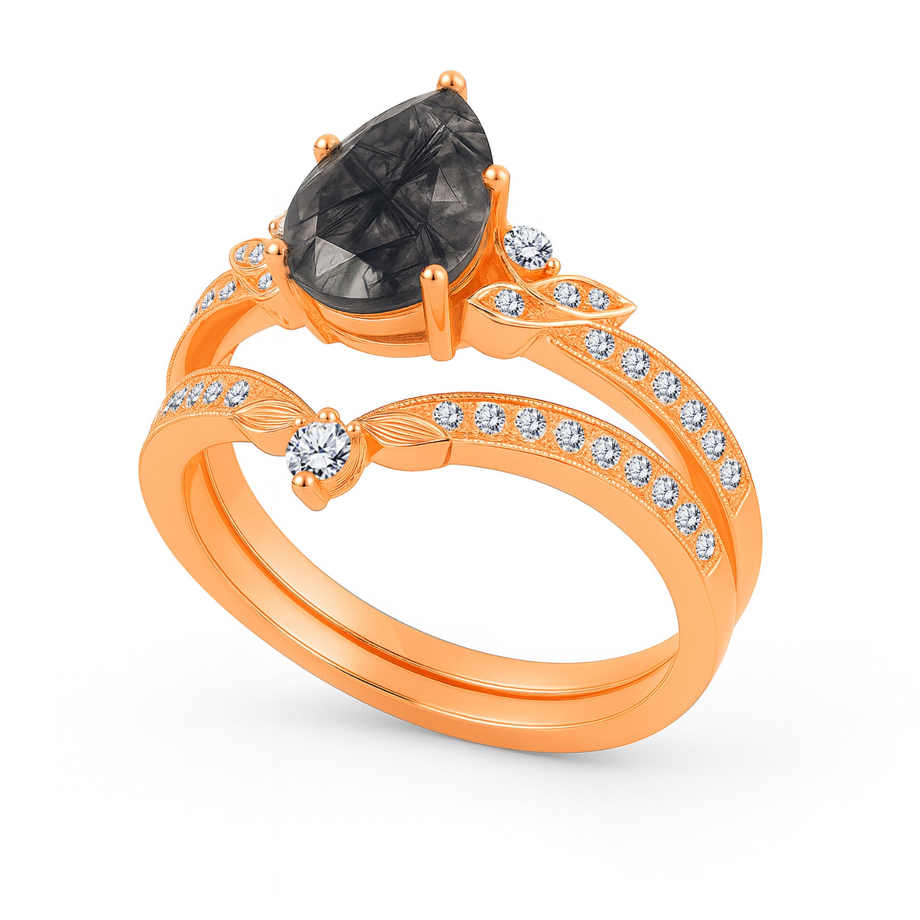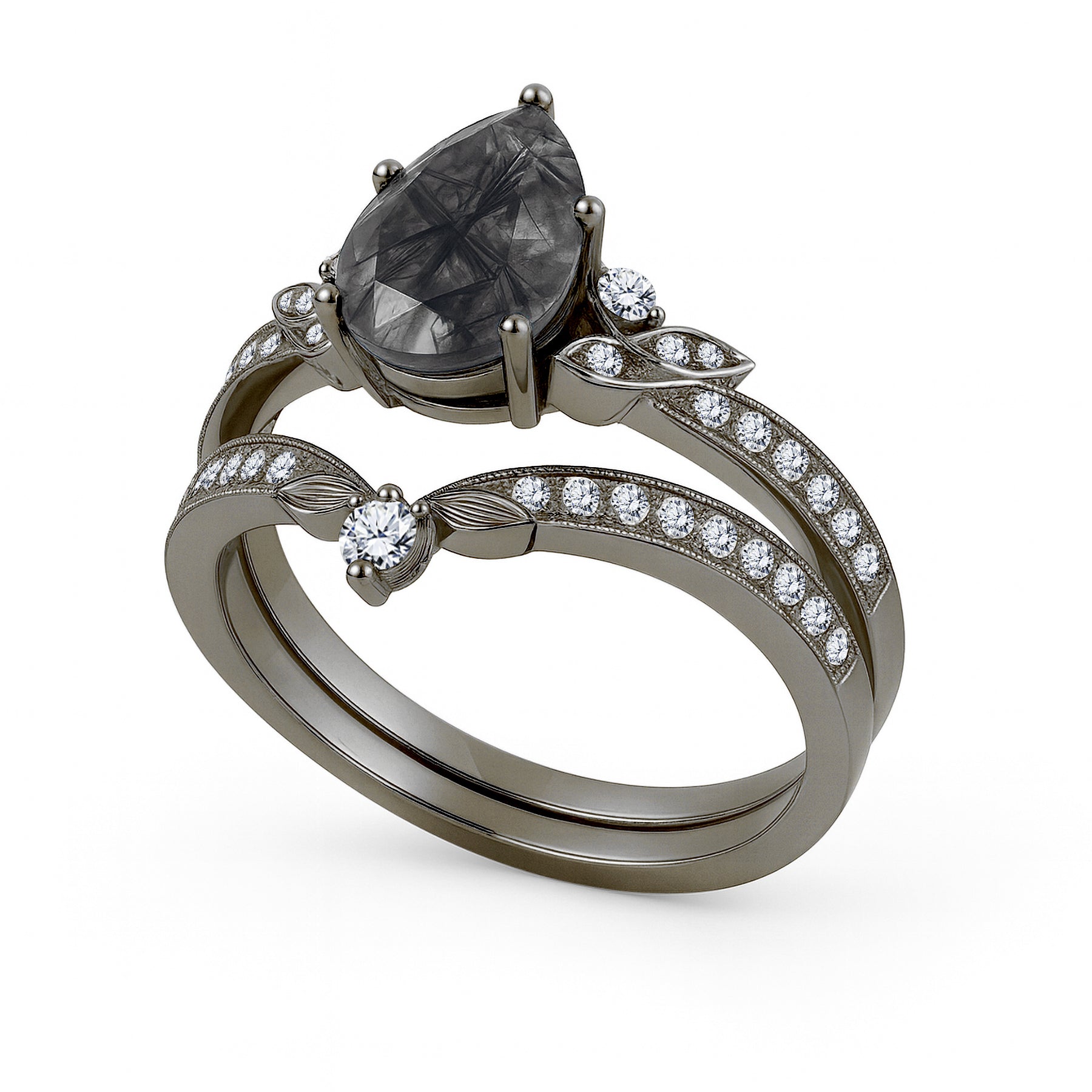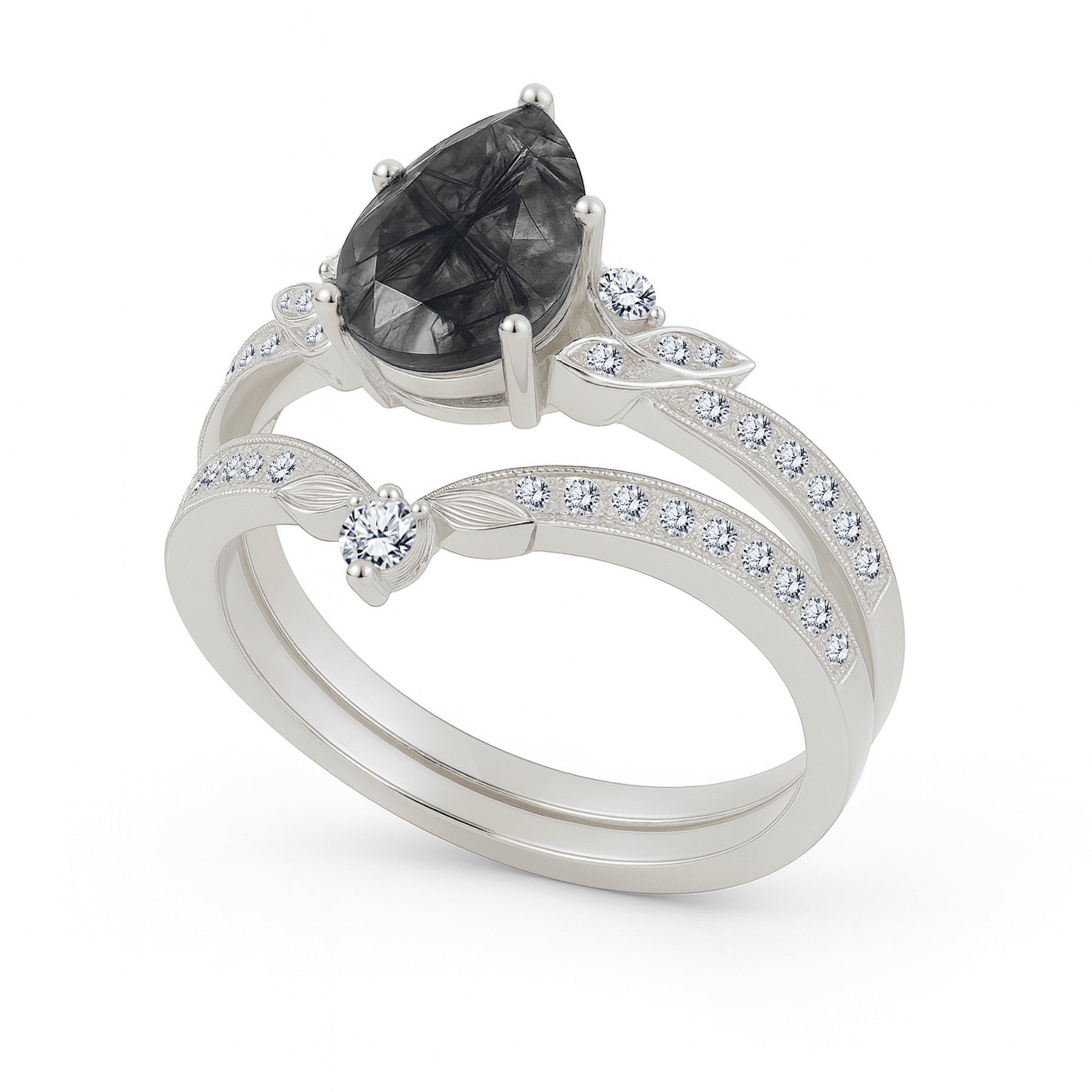 Unique and bold, this bridal set features a striking 1.35 carat pear-cut black rutilated quartz, celebrated for its dramatic strands and one-of-a-kind natural beauty. The 1 carat center stone is complemented by a matching contoured band, together adorned with 0.35 carats of side stones that enhance its brilliance. Sterling Silver: accented with radiant moissanite for modern sparkle. Solid Gold: adorned with diamonds for heirloom elegance. Intricate leaf motifs and milgrain details add vintage charm, while the teardrop silhouette symbolizes tears of joy and everlasting love. Perfect for brides who desire a truly distinctive engagement and wedding set that tells its own story.