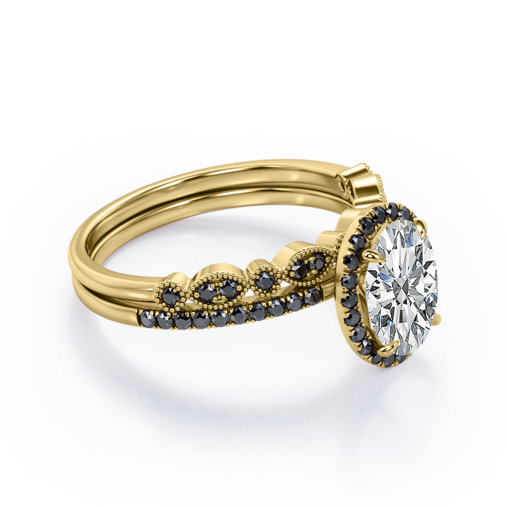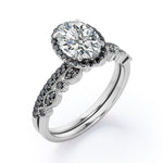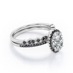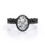 1.65 TCW Oval Cut Moissanite with Lab Created Black Diamond - Milgrain Filigree - Scalloped Pave Bridal Ring Set in White Gold