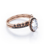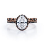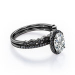 Make your proposal day most memorable with this 1.65 TCW Oval Cut Moissanite with Lab Created Black Diamond - Milgrain Filigree - Scalloped Pave Bridal Ring Set in White gold. Skillfully hand-cut into a nice oval cut by our skilled jewelers, this exceptional moissanite engagement ring set consists of total 1.65 carat moissanite and lab-created black diamonds. Special and non-traditional, this moissanite and sterling silver ring set is well-suited for those who are not quite into normal lifestyle. With naked eyes moissanites look, shine and feel exactly like diamonds. Reflective properties of this moissanite engagement rings set will unquestionably be an essential additional to any jewelry collection. This moissanite wedding ring set is beautiful and accessible since it is available at a reasonable price. Moissanites are the most popular alternative gemstone for diamonds while being at lower and more affordable price. Considered as a symbol of timeless love and affection for your lover, this moissanite stone ring set can definitely help you out. This best moissanite ring set can be customized, so customers can choose one of metal colors between White gold, rose gold, yellow gold and black gold in 18k Gold over Silver, 10k and 14k gold metal options. In regards to its hardness, moissanite is almost as hard as diamond which means that it is notably durable. Let’s impress her with this moissanite jewelry, and she will be eternally joyful.