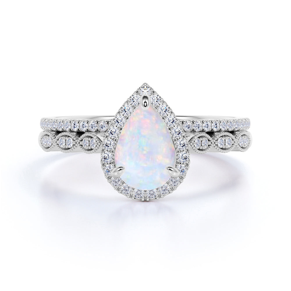 1.75 ct Antique Pear Shaped Fire Opal and Moissanite Wedding Ring Set in 18K White Gold over Silver