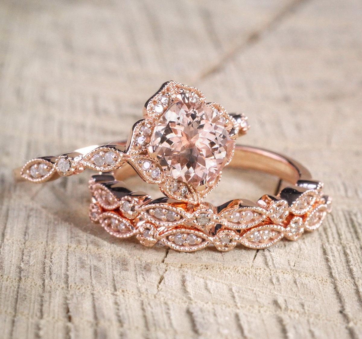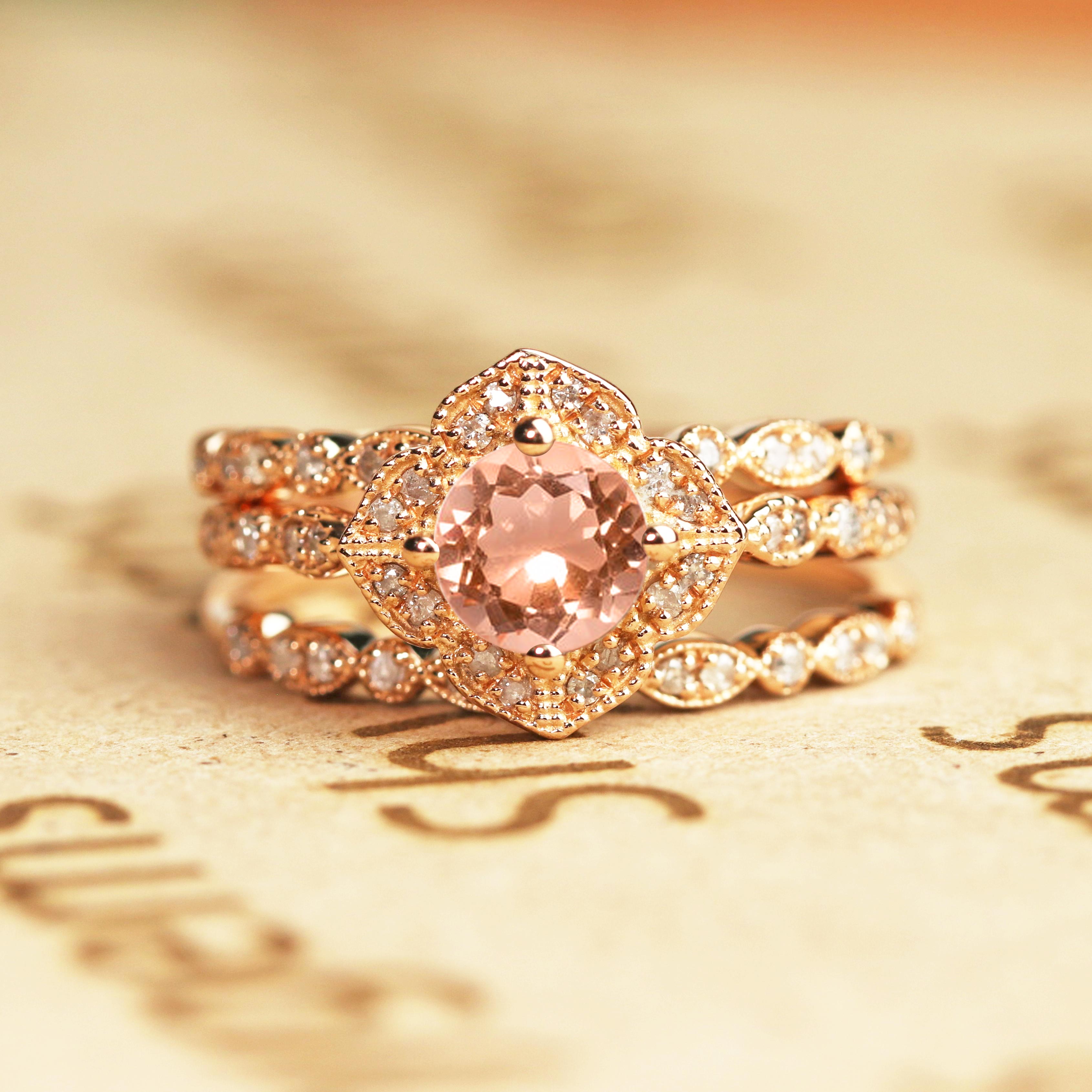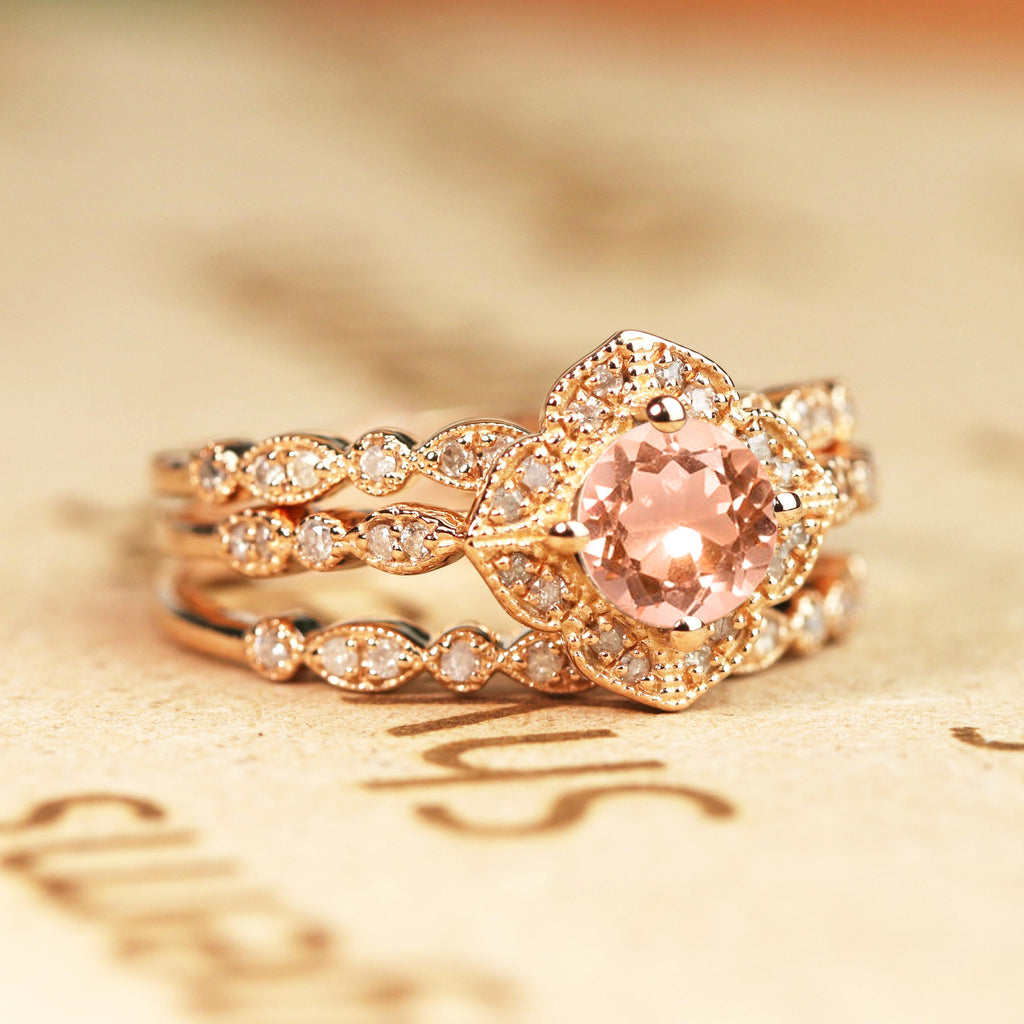Limited Time Sale 1.50 carat Morganite Diamond Trio Wedding Bridal Ring Set in 10k Rose Gold with Engagement Ring & 2 Wedding Bands