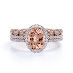2 Carat Oval Cut Art Deco Morganite and Moissanite Trio Wedding Ring Set in 18k Rose Gold Over Silver