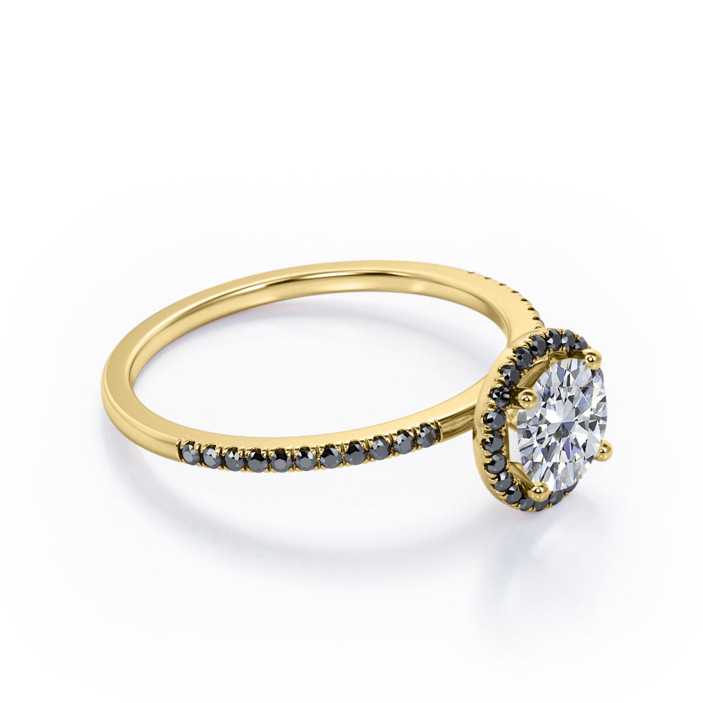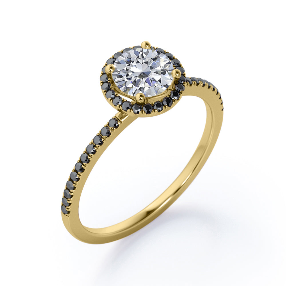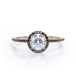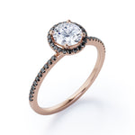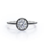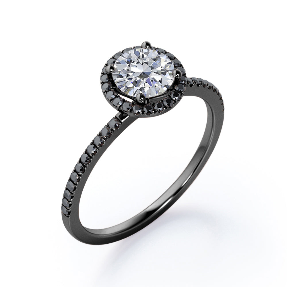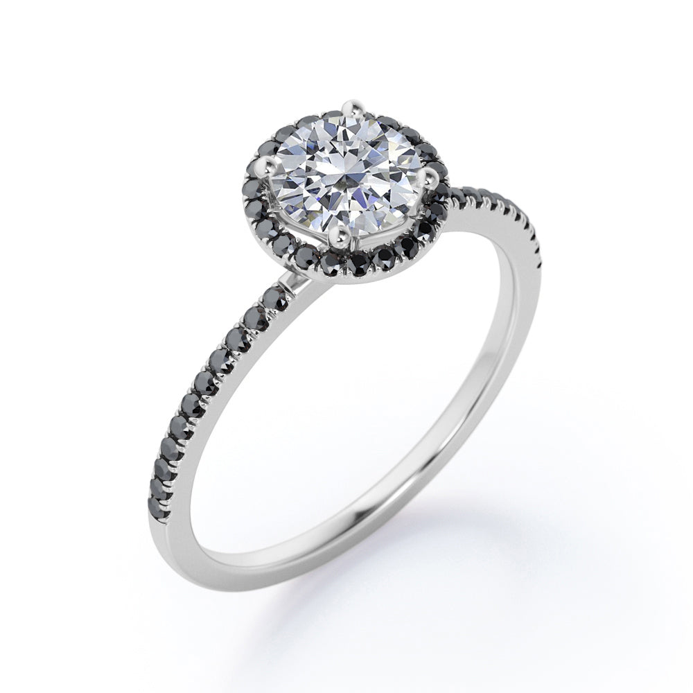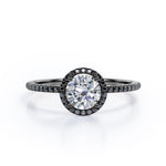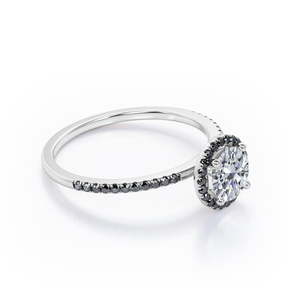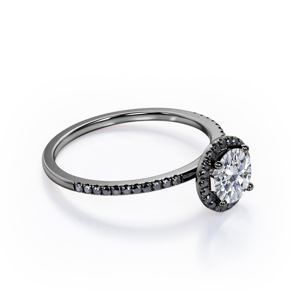 Create a magical moment with this 4-Prong Halo 1.5 TCW Round Shape Moissanite with Lab Created Black Diamond Pave-Style Engagement Ring in White gold. Skillfully hand-cut into a nice round cut by our experts in lapidary, this exceptional 925 moissanite ring is composed of total 1.5 carat moissanite and lab-created black diamonds. Distinctive and extraordinary, this moissanite band is well-suited for those who are not quite into normal lifestyle. With naked eyes moissanites look, shine and feel exactly like diamonds. With its glory and clarity, this 925 moissanite ring will absolutely enhance every style of its wearer. This moissanite ring is beautiful and accessible since it is available at an affordable price. Moissanites are the most popular alternative gemstone for diamonds while being at lower and more affordable price. For those who have no idea what to surprise your life partners, this moissanite stone ring can be a good choice for any special occasion, i.e. a birthday ring, an engagement or marriage proposal ring, a Valentines' day ring, etc. Also, this best moissanite ring can be customized to your own choice of metal colors: white gold, rose gold, yellow gold and black gold in 18k Gold over Silver, 10k and 14k gold metal options. In regards to its hardness, moissanite is almost as hard as diamond which means that it is notably durable. Let's fulfill your love story with this moissanite jewelry and, surely, she will not regret it.