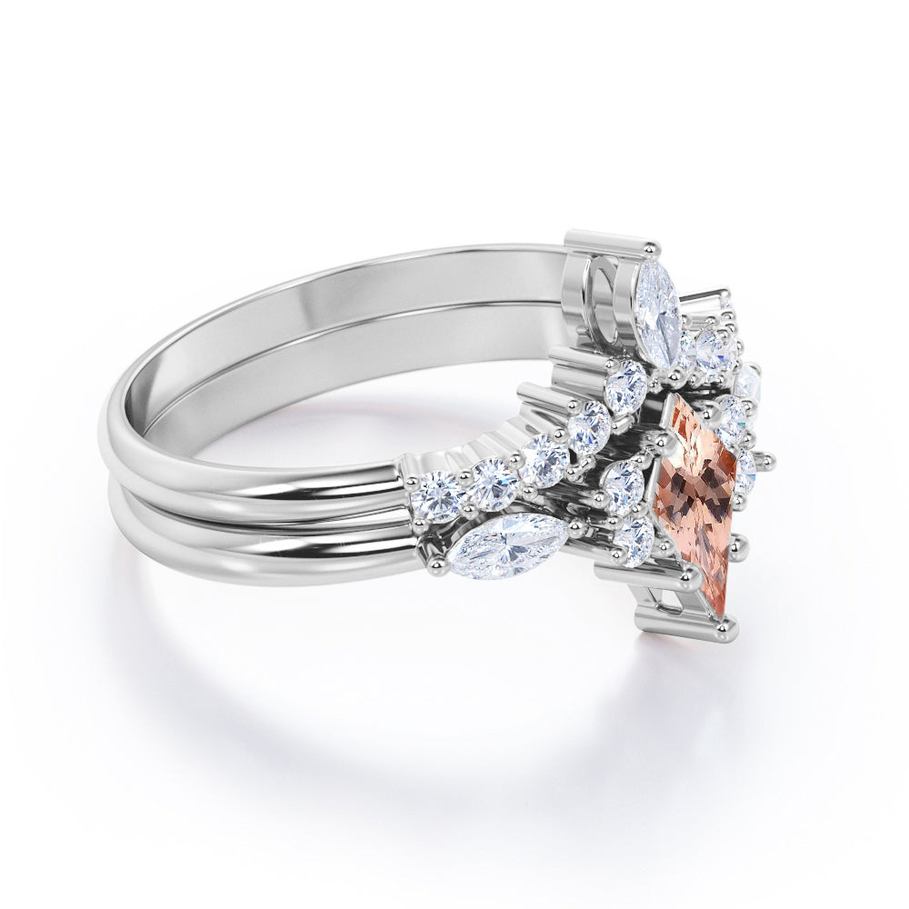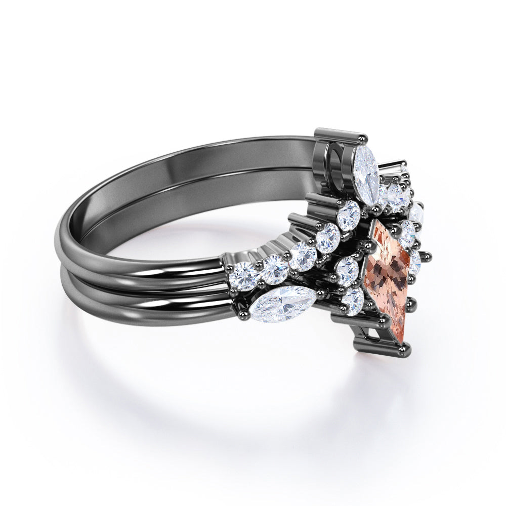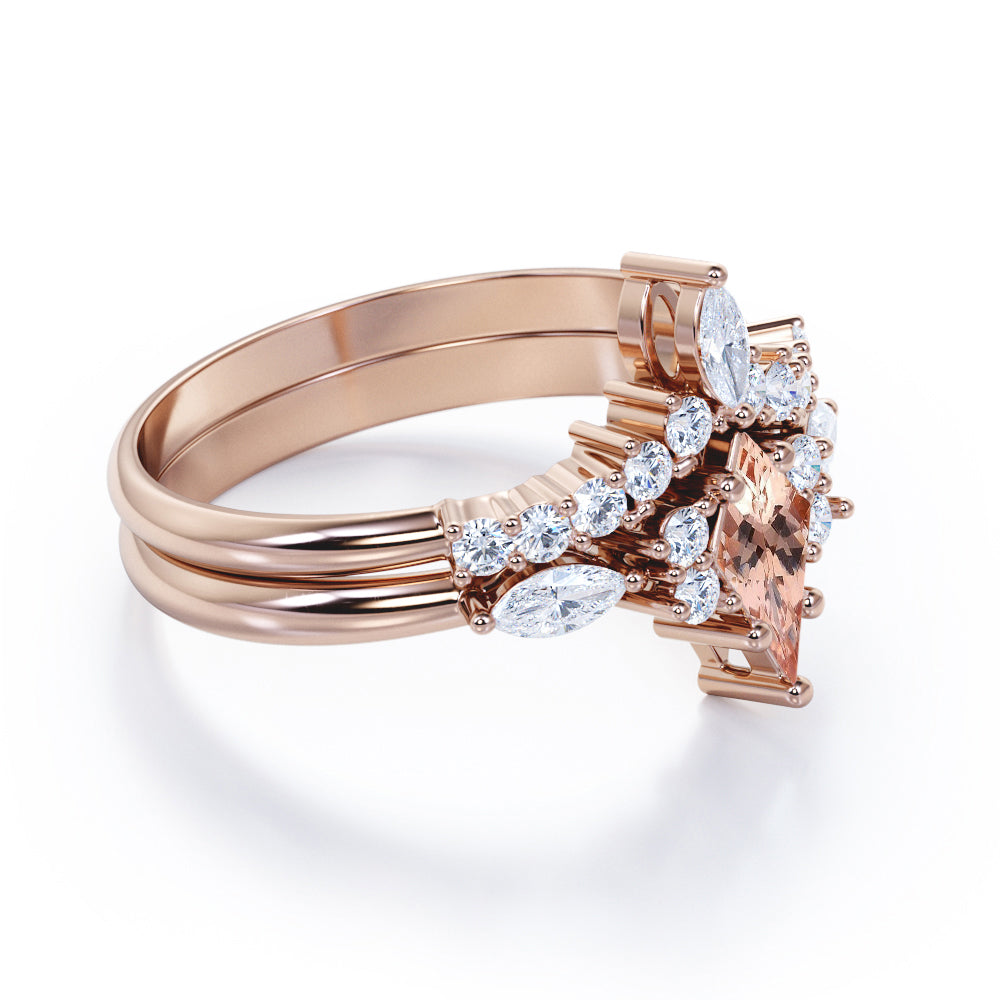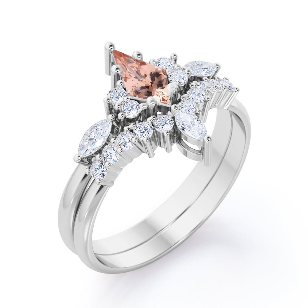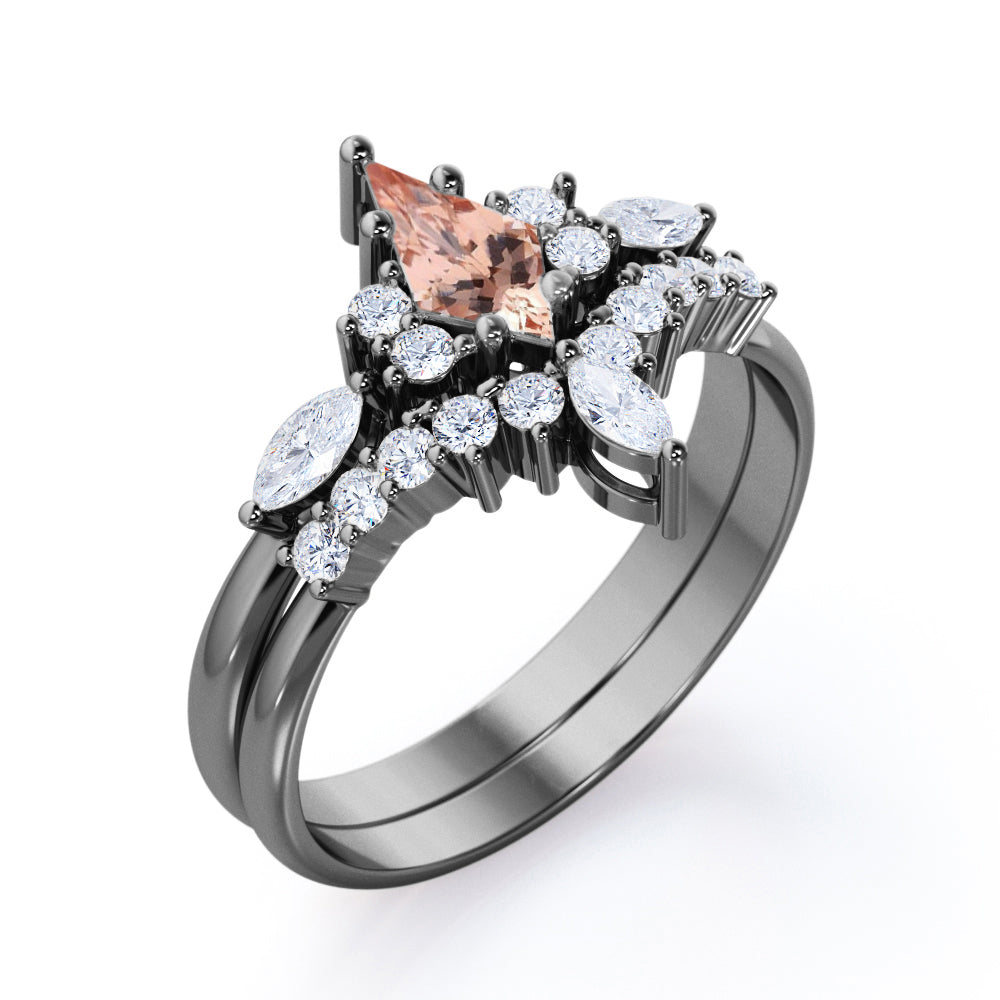 Elegance as much as it can be, a 7 Stone Ring - 0.65 carat Kite Morganite and Moissanite Bridal Ring Set in Rose Gold glistens all the way to her hand. The engagement ring features a 0.5 carat kit Morganite with two round Moissanite and marquise Moissanite on each side of it. A contoured wedding band comes in the set and it is garnished by marquise Moissanite on top. Round Moissanite cascade down along the band. The wedding ring set can be made in 18k gold over silver, 10k gold and 14k gold with the color of white gold, rose gold and black gold.