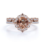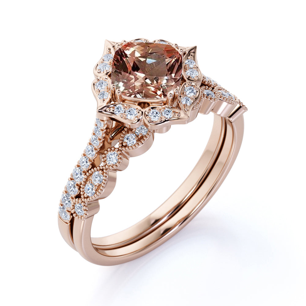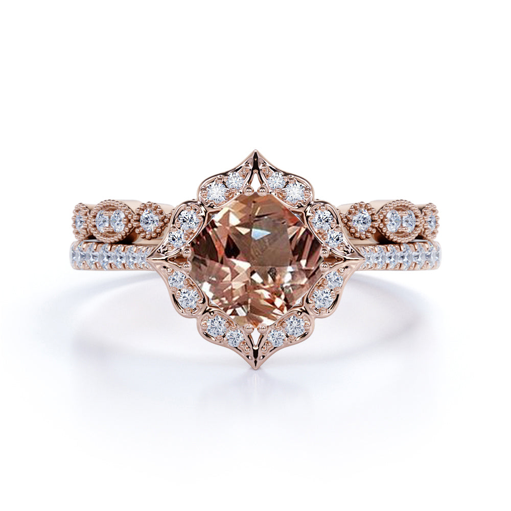 Antique 1.50 ct Cushion Morganite Halo Bridal Set
