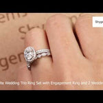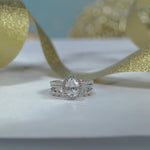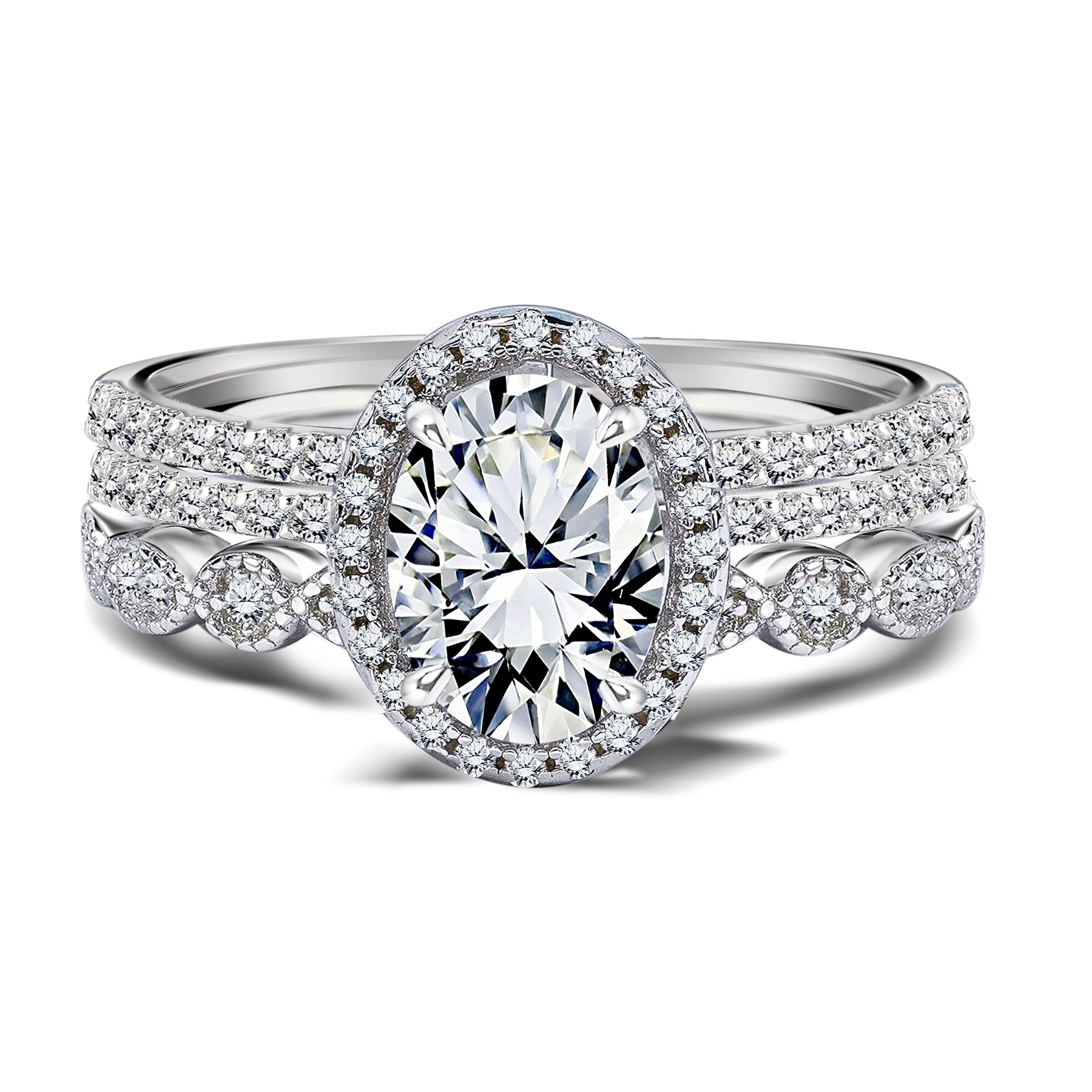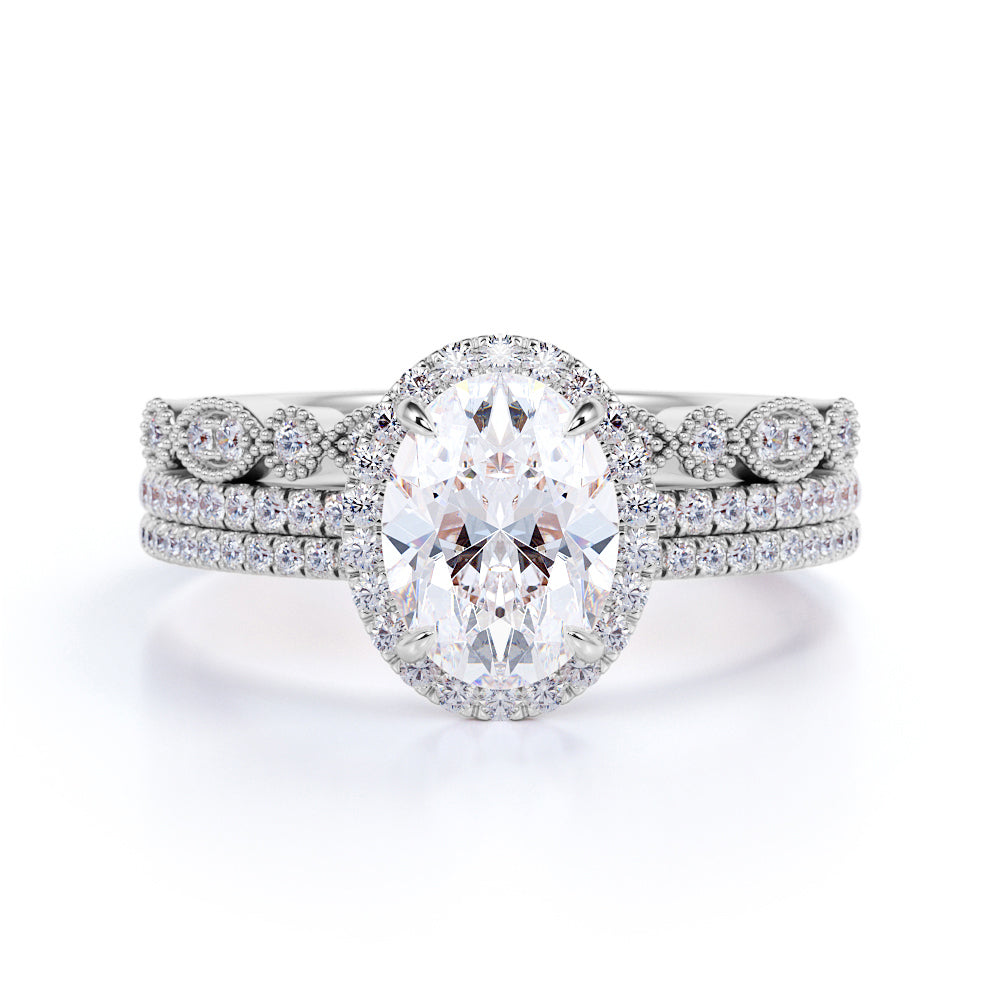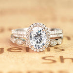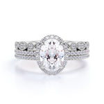 Art Deco 2 Carat Oval cut Real Moissanite Wedding Trio Ring Set with Engagement Ring and 2 Wedding Bands in 18k Gold Over Silver