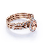 Art Deco 1.75 Carat Pear Shape Peach Morganite and Diamond Trio Wedding Ring Set in Rose Gold