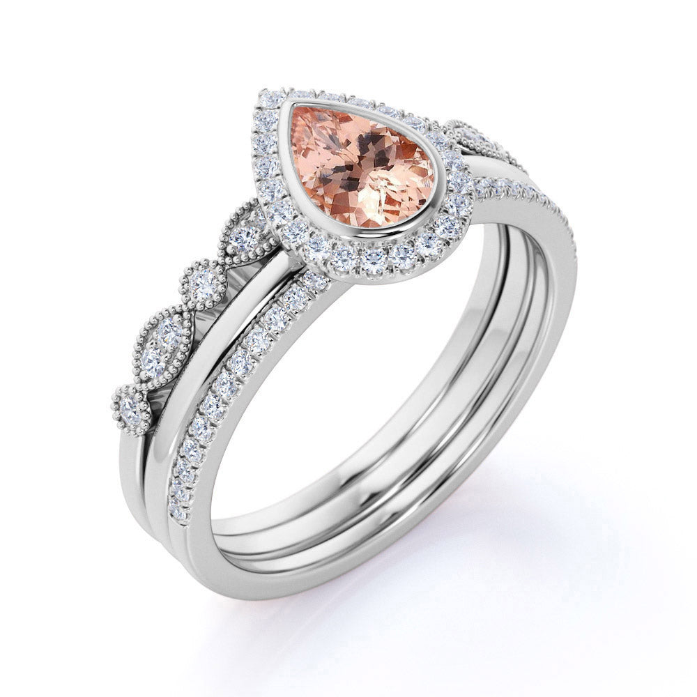 This is a very beautiful handmade art deco style Morganite and Diamond Trio Wedding Ring Set for women. The trio bridal wedding ring set is made with real peach pink morganite, real diamonds and on real gold. The handcrafted engagement ring features peach pink 1 carat pear shape morganite in the center, and 2 matching wedding ring bands have 0.75 carat of diamonds together, for a total carat weight of 1.75 Carats.