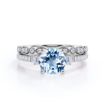 Bestselling 1.75 Carat Antique Design Round cut Aquamarine and Diamond Wedding Ring Set in White Gold. Fascinating sparkling aquamarine wedding ring set features 1 carat perfect real blue aquamarine and 0.75 carat glittering diamonds and is made in solid 10k White Gold. The beautiful wedding ring band is handmade and personalized by me or one of my other skilled jewelry associates with over 15 years of experience.