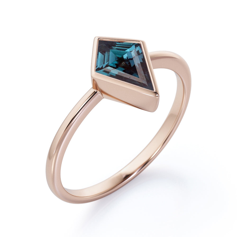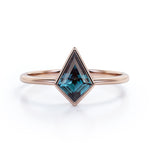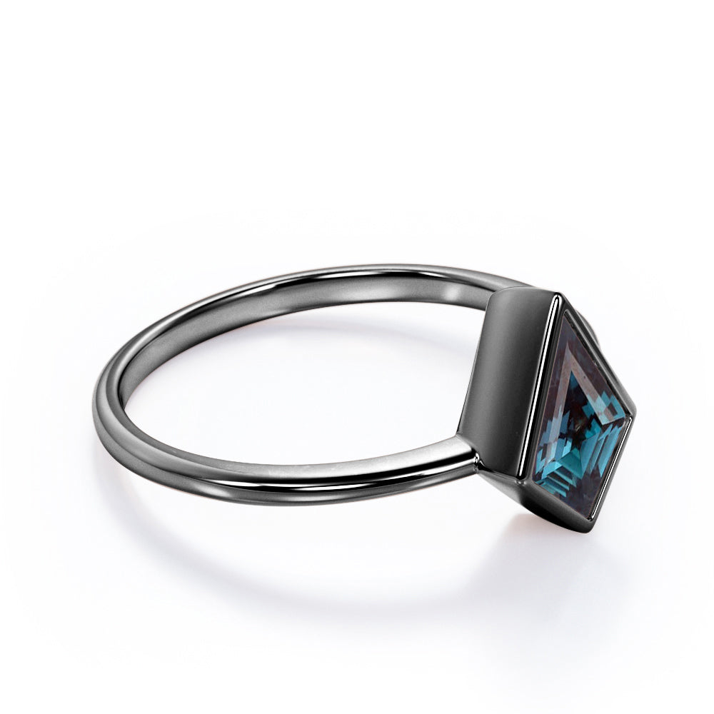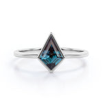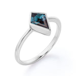 Bezel Set 0.85 Carat Kite Shaped Lab Created Alexandrite Solitaire Engagement Ring In White Gold. Not all engagement rings require gems and jewels. This understated design is oh-so chic without the adornments of glittering stones. Create a fascinating look on your finger with this kite shaped lab grown luscious teal purple alexandrite engagement ring of 0.85 carat. Its solitaire design feels utterly timeless and classic. The bezel set alexandrite at the center radaites deep jewel tones on its own. All our products are handmade with utmost love and detailed attention by our well-experienced craftsmen to satisfy your expectations. Subtle yet striking, this bezel set 0.85 carat kite shaped lab created alexandrite solitaire engagement ring can also be customized to 18k Gold plating over silver, 10k Gold or 14k Gold as per your preference. So what are you waiting for? Press add to your cart button now and make this alluring engagement ring all yours.