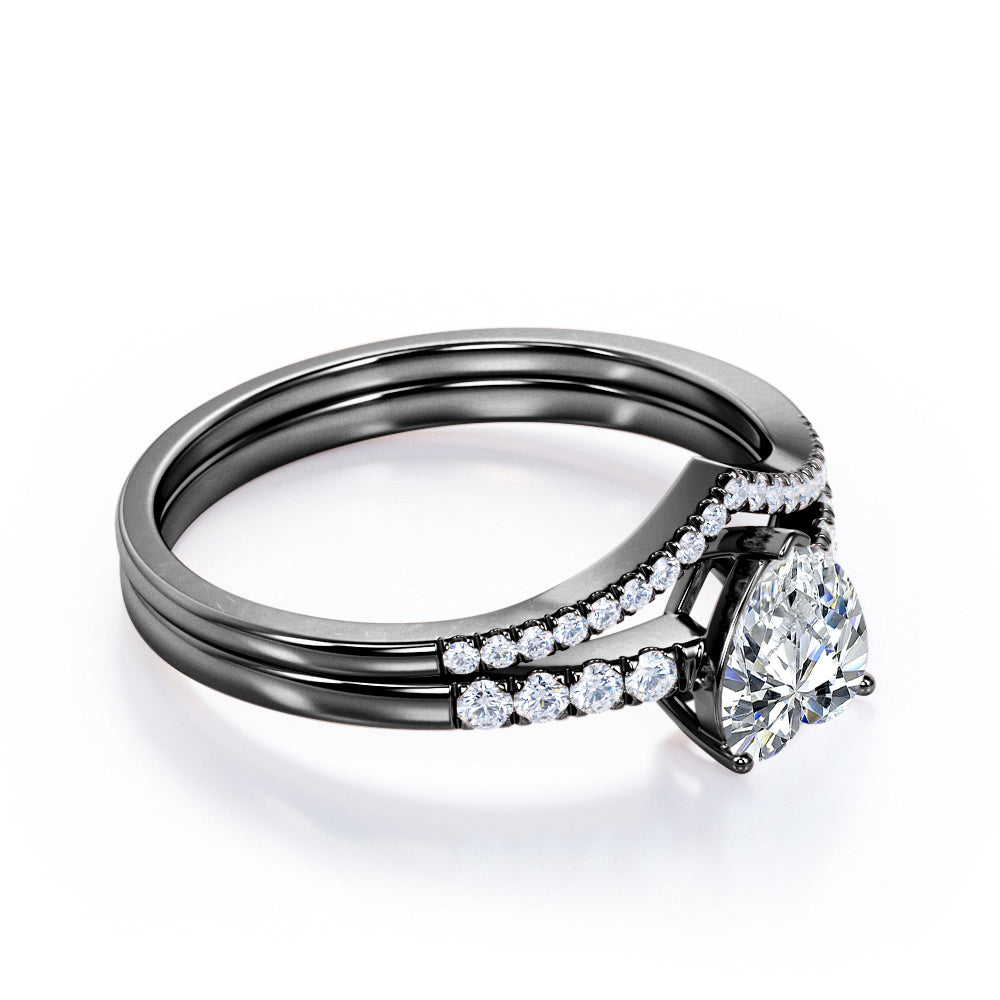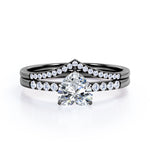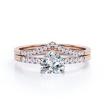 Honor your love with Cherished 0.7 carat Heart Moissanite and Diamond Bridal Ring Set in Rose Gold. The engagement ring boasts a 0.5 carat lovely heart Moissanite and features petite round Moissanite on the band; 4 stones on each side. Chevron Wedding also comes in the set and it matches perfectly with the promise ring. The wedding band possesses paved dainty round Moissanite that enhances the sparkle of the promise ring. Don't miss a chance to get this splendid wedding ring set for your lover. It is available for your purchase at a very low price and can be customized in 18k gold over silver, 10k gold, 14k gold with the color of white gold, rose gold, yellow gold and black gold.
