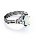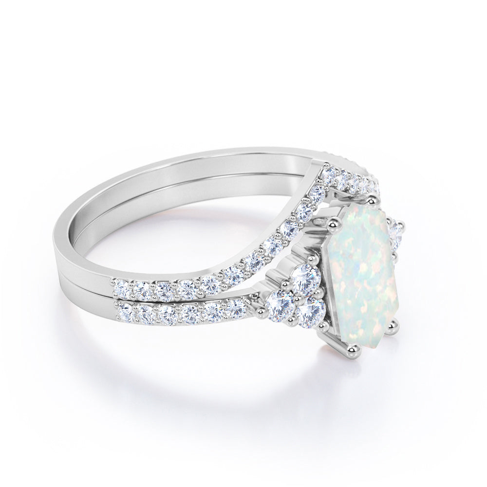 Chevron Pave Set 1.55 Carat Hexagon Cut White Fiery Opal And Diamond V Shaped Wedding Ring Set In Black Gold. You're not missing out on any sparkle with this seven stone wedding ring set. Featuring a row of brilliant round diamonds on a white gold band, we love the stunning contrast and amazing brilliance that this piece exudes. This magnificent wedding ring set comprises of one engagement ring and a matching wedding band. The engagement ring features 1 carat solitaire hexagon shaped natural opal as the center stone complemented by three set of round shaped diamonds on either sides inclusive of the matching V shaped wedding band. The pave set diamonds of 0.60 carat in this wedding set illuminates great brilliance and undeniable sparkle which will surely make you stand out in the crowd. The four prongs holds the center stone perfectly letting it be the show of the overall set. Handmade by our old artisans, this Chevron pave set 1.55 carat hexagon cut white fiery opal and diamond V shaped wedding ring set in black gold can also be customized to 18k Gold plating over silver, 10k Gold or 14k Gold as per you preference.