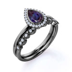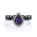 Be on cloud nine with this Classic 1.50 Carat Pear Shape Lab Created Alexandrite and Diamond Halo Art Deco Bridal Set Rings. This antique rings feature 1 carat pear cut lab grown Alexandrite and .25 carat real genuine side diamond for gold ring and moissanite for silver ring. This intricate wedding ring sets can be customized to either 10k, 14K and Gold over Silver and either Black Gold, Rose Gold, White Gold or Yellow Gold. Also, as your satisfaction is our most priority, we will do our best to have your handmade jewelry be carefully and beautifully crafted by our expert jewelers. The order also comes with a 30-day full refund policy. Enrich your charm and charisma with this vintage mystic lab grown Alexandrite ring for women that is excellent for everyday wear. With its unique ability to exhibit two colors, this ring will make you stand out from others. This flawless ring will be a perfect fit for you love story as it is believed that joy enters the lives of people through the stone. If you are searching for some alternate gemstone, this Friday's stone ring will be your right choice. This simulated Alexandrite ring gives a vivid grass green color in daylight and displays an intense raspberry red in candescent light. Embellish your love story with this beautiful man made Alexandrite ring and make it even more memorable. If you are in search of a perfect gift for any occasion, this delicate and stunning ring is the best answer for you. This ring is available at a very affordable price yet it offers a very expensive and gorgeous look on your finger. Impress your special someone with this beautiful and affordable lab created Alexandrite ring. With its mesmerizing color-change variety and unparalleled vibrancy, this flawless lab grown Alexandrite ring will enchant your special someone with gracefulness.