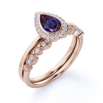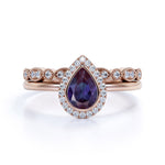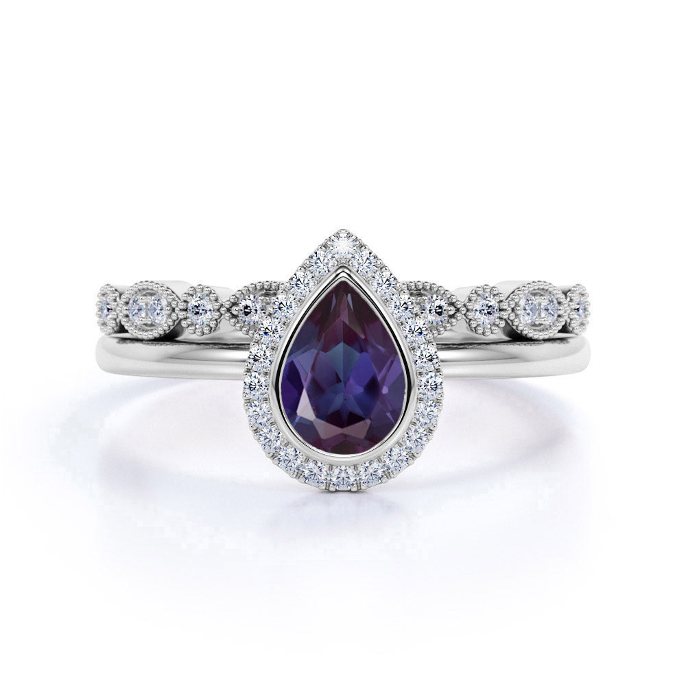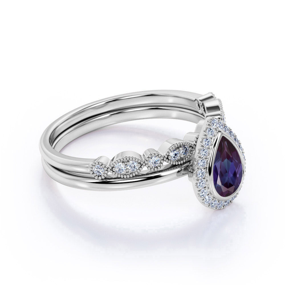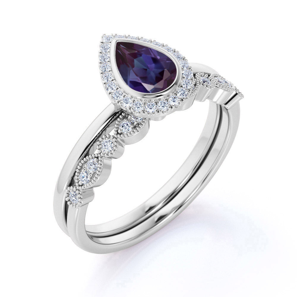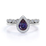 Classic 1.50 Carat Pear Shape Lab Created Alexandrite and Diamond Halo Art Deco Bridal Set Rings