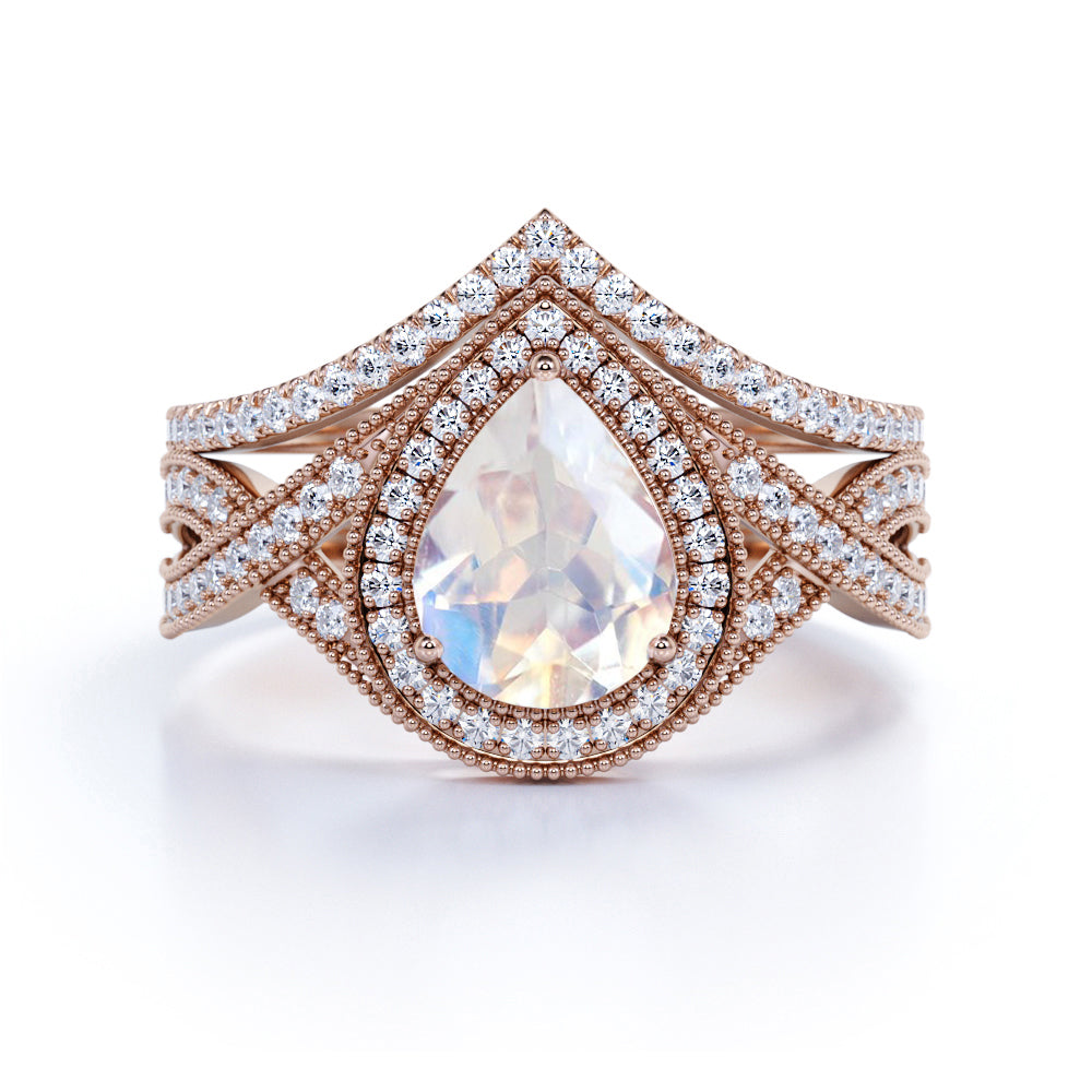 Enchanting on its own way, this rainbow moonstone and diamond bridal set displays a variety of colors from different angles when being passed by a light source. This classic art deco engagement ring features an approximately 1 carat pear shape natural rainbow moonstone in the center of the engagement ring, surrounded by .50 carat real diamonds for gold ring and moissanite for silver ring, for a total weight of 1.50 carats.
