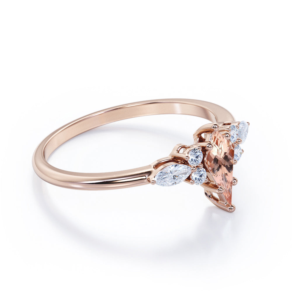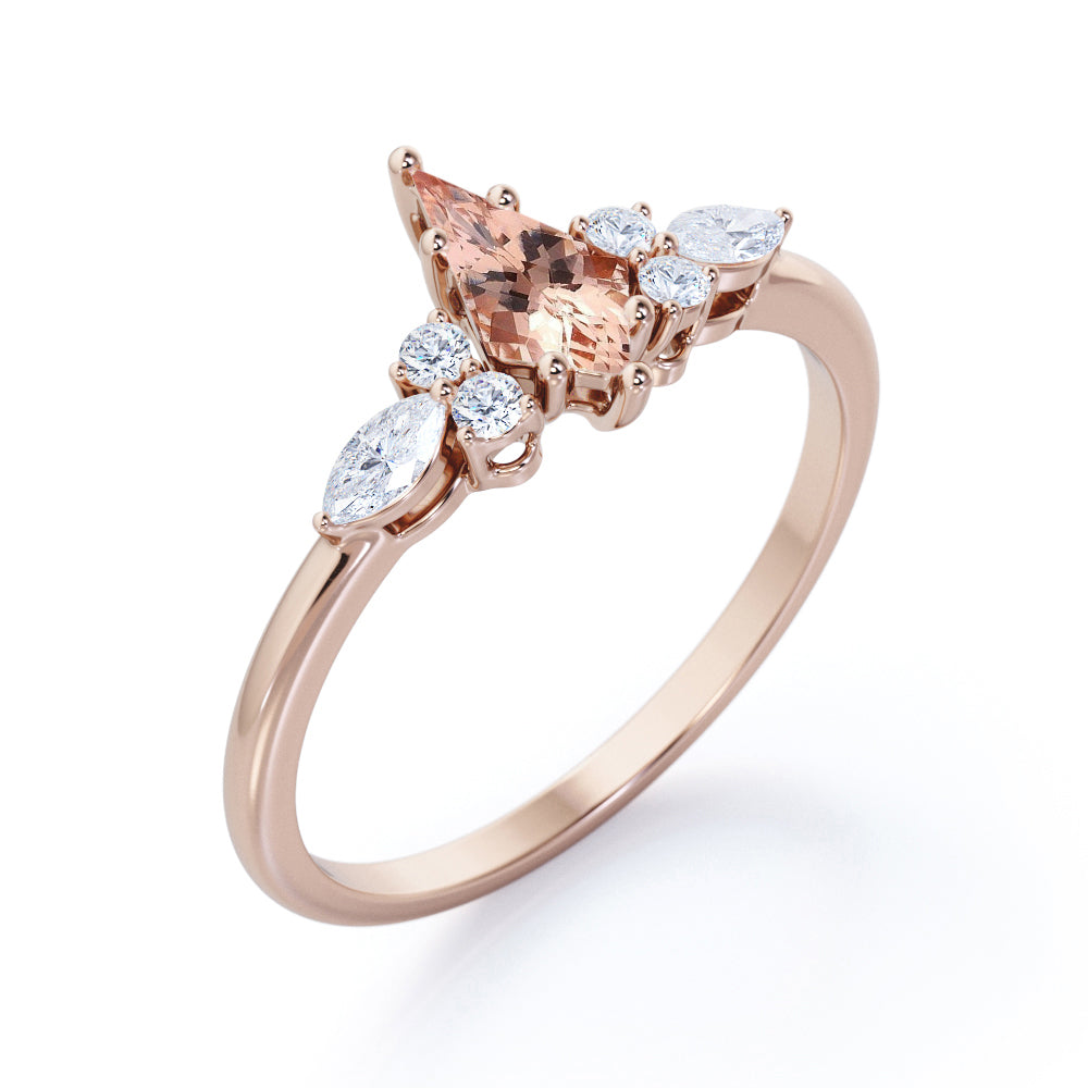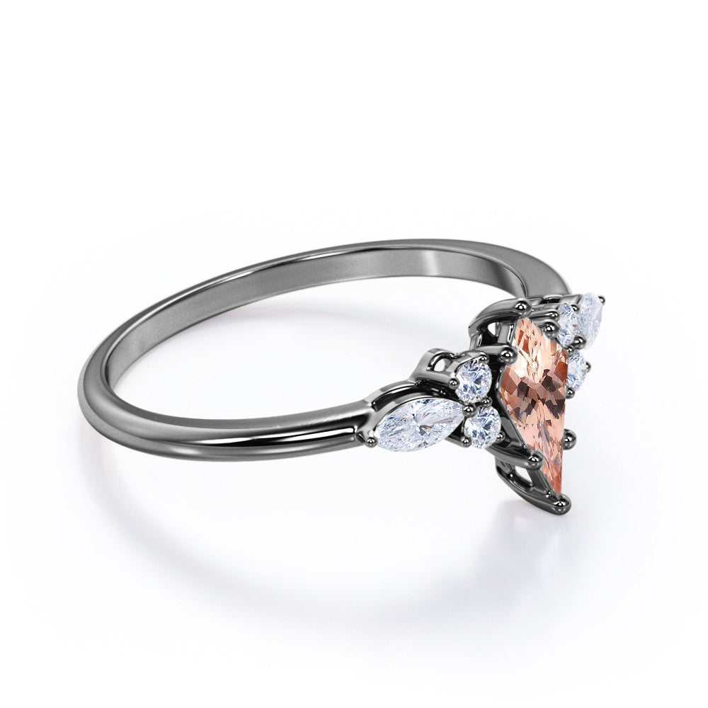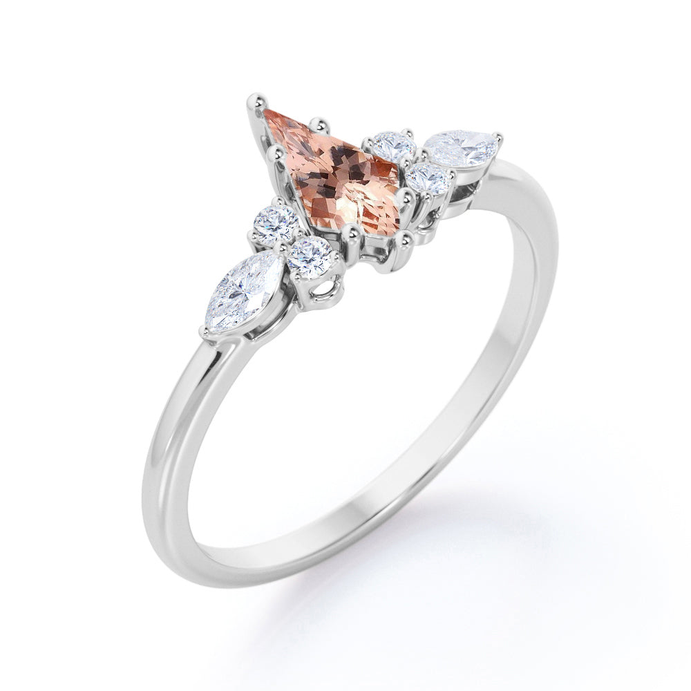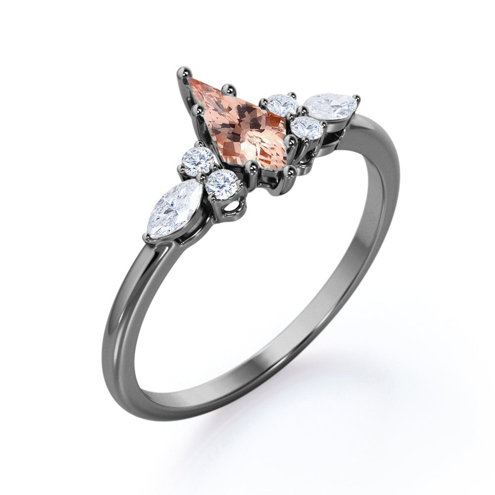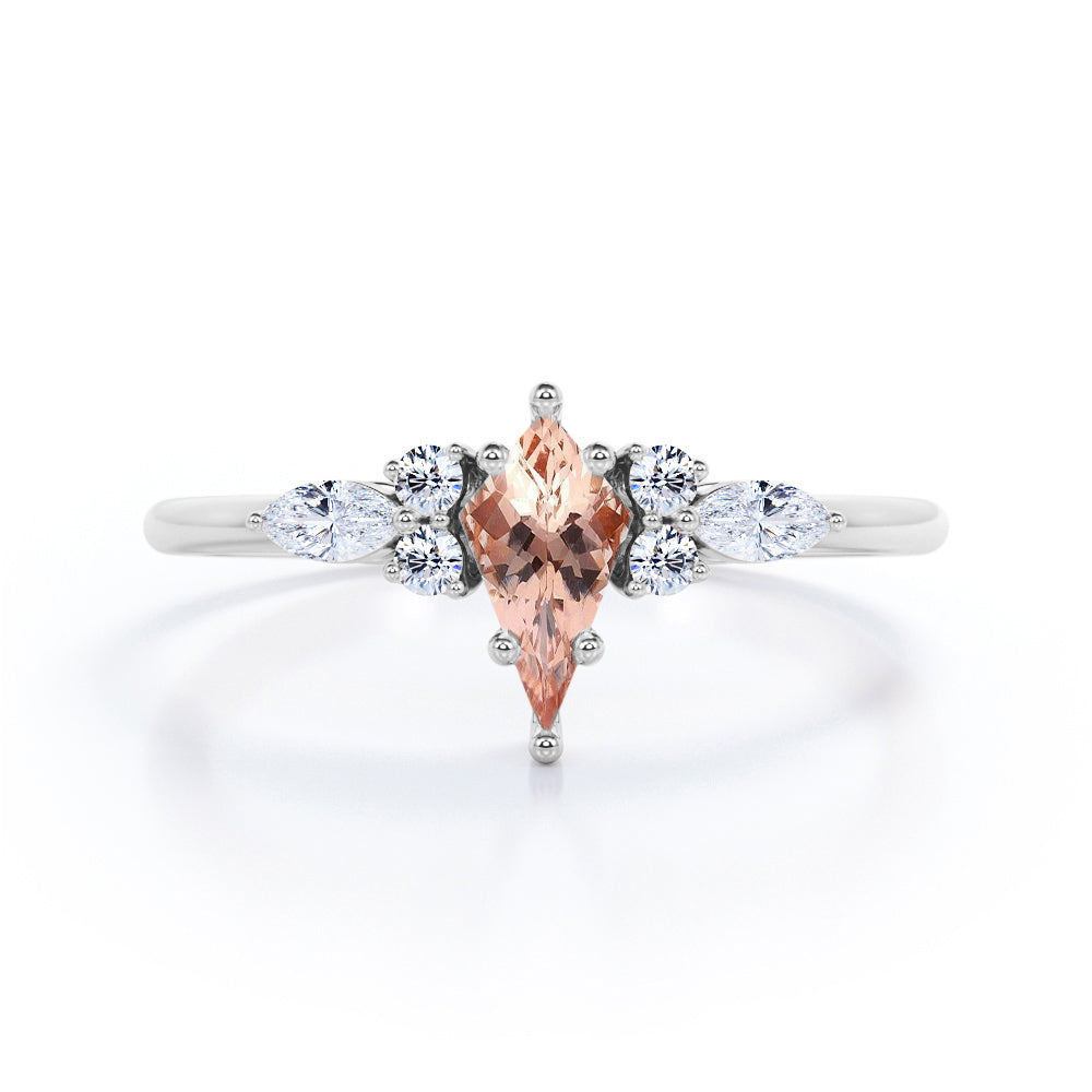 Our new design, Classic Seven Stone 0.55 carat Kite Morganite and Moissanite Dainty Engagement Ring in White Gold features a 0.5 carat kite Morganite and it is flanked by two round Moissanite on each side and follows by marquise Moissanite in east-west setting. The dainty band can be made in 18k gold over silver, 10k gold and 14k gold with the color of white gold, rose gold, and black gold. Morganite is believed by some people to be a stone of divine love. So if you are looking for a love charm for your relationship, this ring might be an option for you.