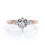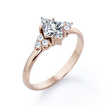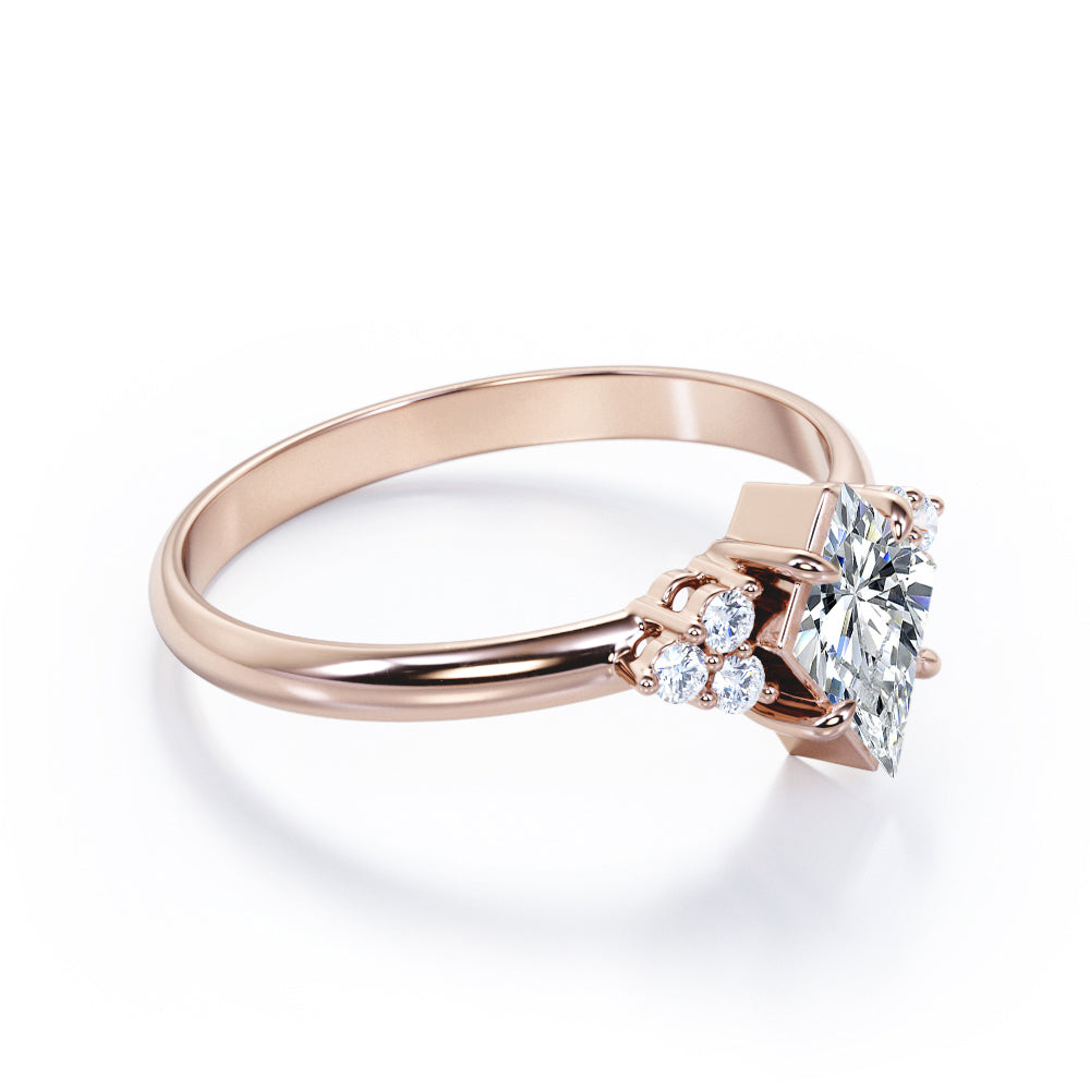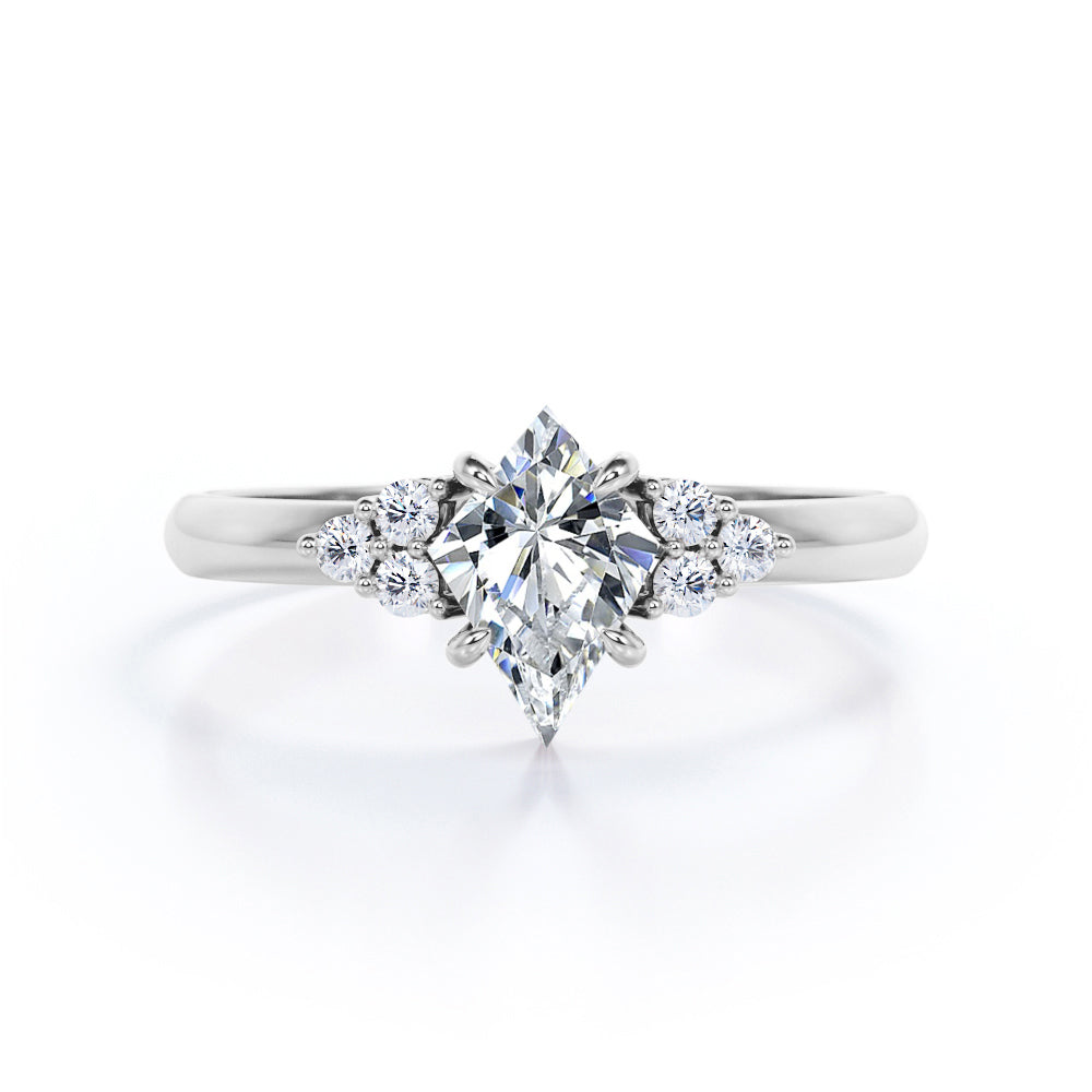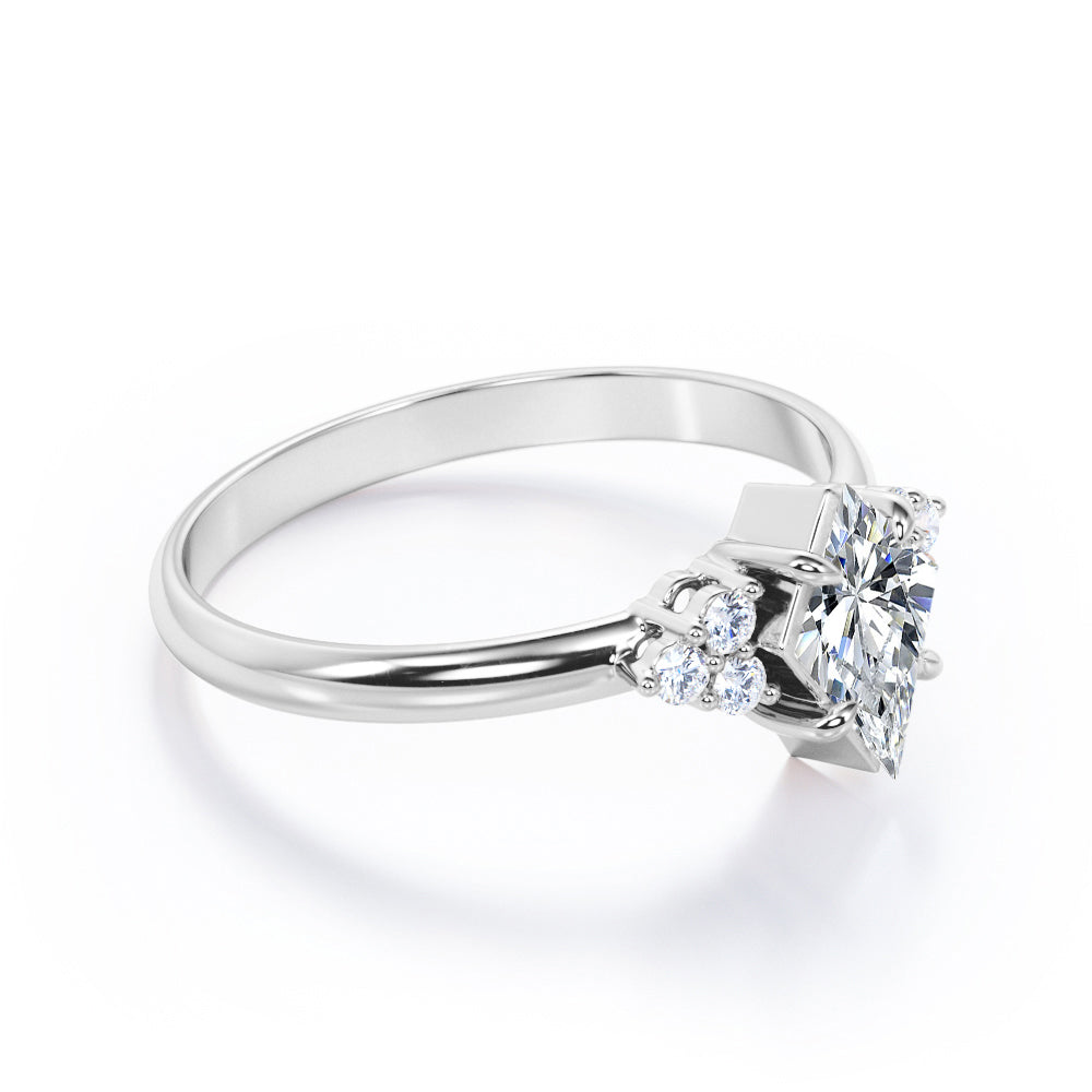 Make your whole outfit look more magnificent with the Clustered Triangle 0.55 carat Kite Moissanite and Diamond Engagement Ring in White Gold. The promise ring boasts a 0.5 carat kite Moissanite as a center stone and decorated by clustered three stone triangle on each side of the band, elongating the pointy angles of the quadrilateral Moissanite. Side stones act as the spotlight and enhance the brilliance on the ring. Not only this Moissanite ring is a good choice for a proposal but it can also be anniversary gift, new year gift or birthday gift. Choose the color that would look lovely on her finger most; white gold, rose gold, yellow gold and black gold. It can also be customized to 18k gold over silver, 10k gold, 14k gold.